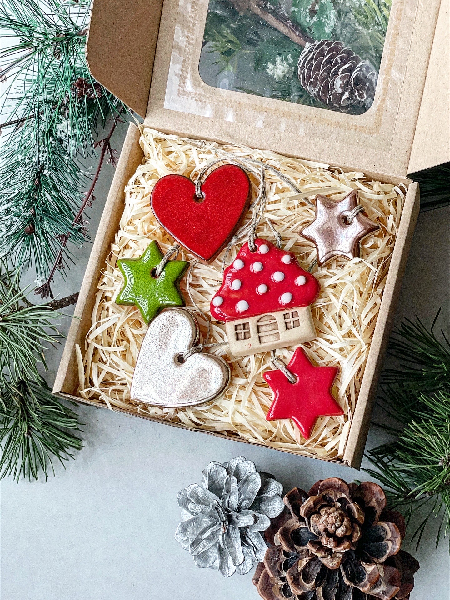 Zestaw 6 ceramicznych ozdób choinkowych zapakowanych w pudełko (16,5 cm x 15,5 cm) z okienkiem i z siankiem dekoracyjnym.
