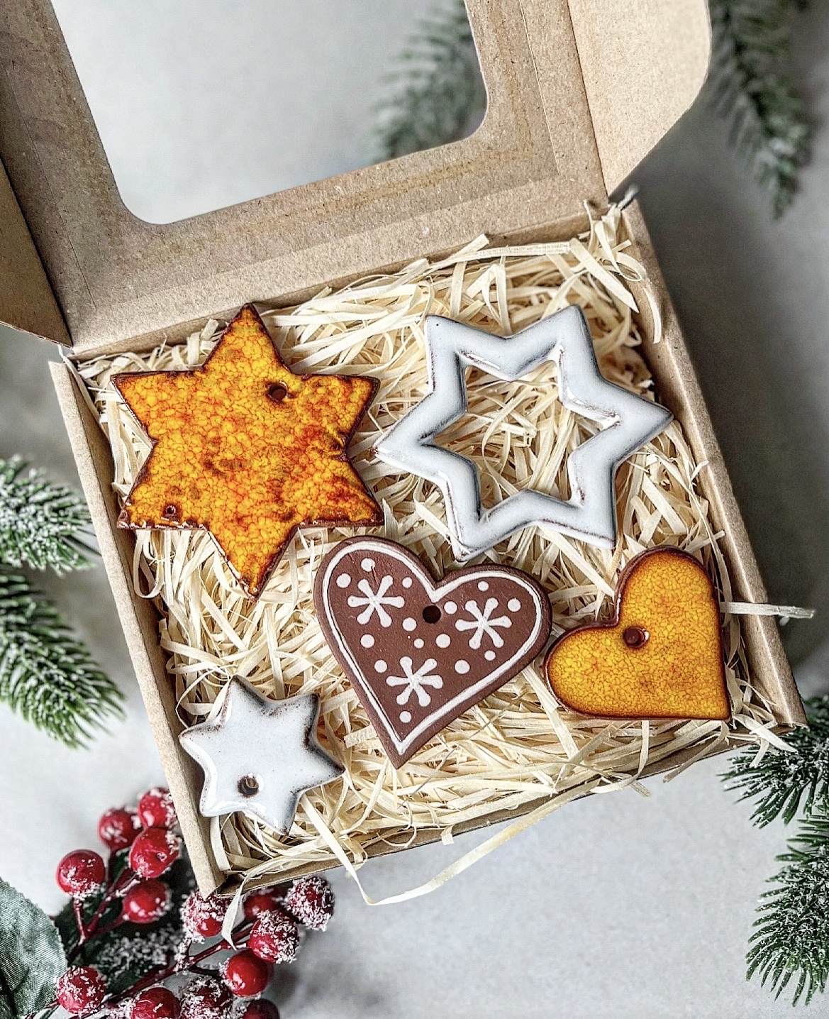 Zestaw 5 ceramicznych ozdób choinkowych zapakowanych w pudełko (16,5 cm x 15,5 cm) z okienkiem i z siankiem dekoracyjnym.