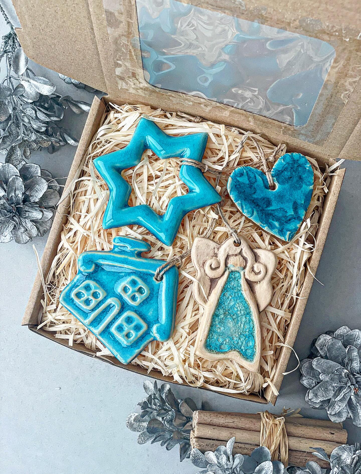 Box świąteczny TURKUSOWY mały (4 ceramiczne ozdoby choinkowe)