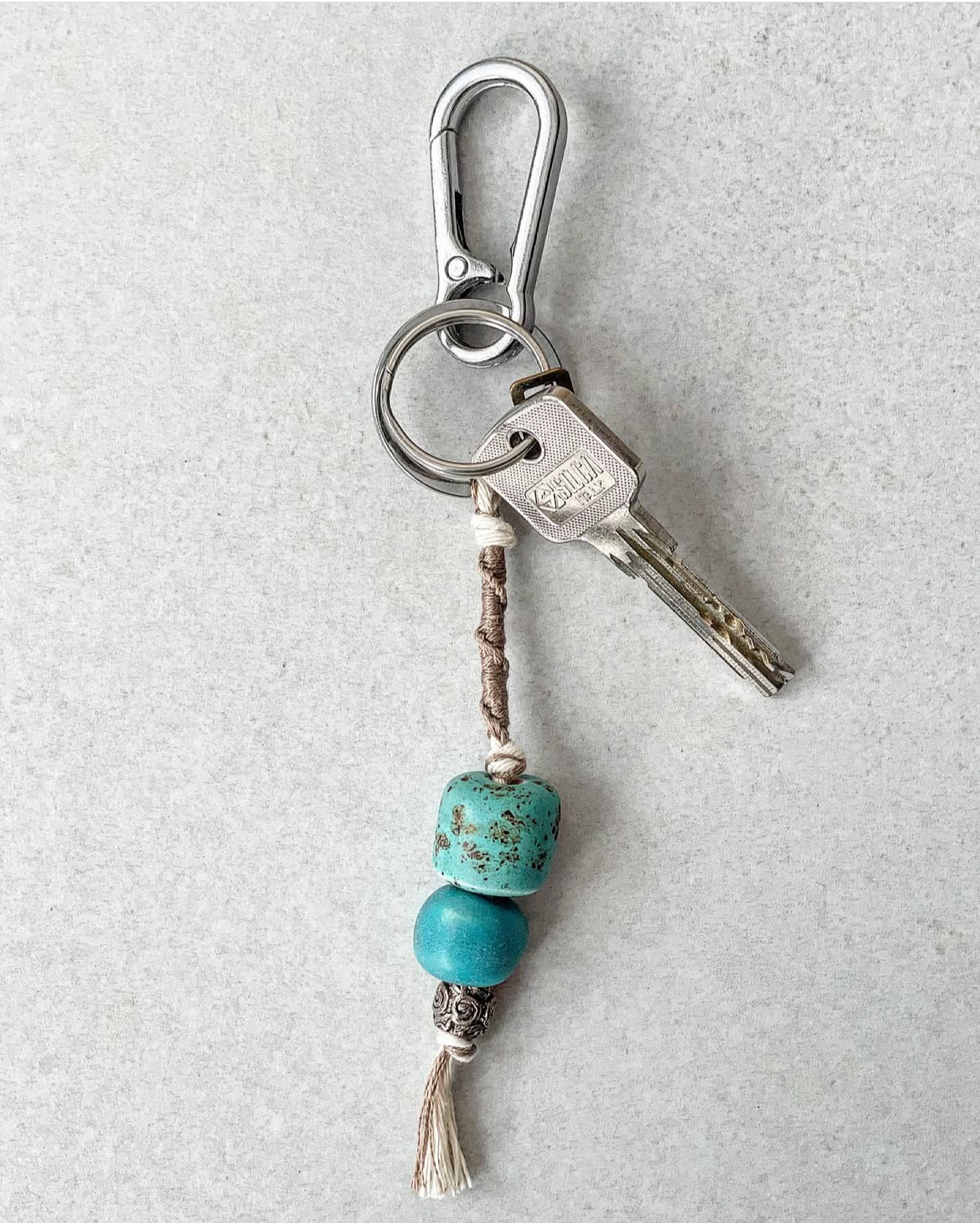 Ręcznie pleciony brelok, z ceramicznymi koralikami. Z zapięciem typu karabińczyk.