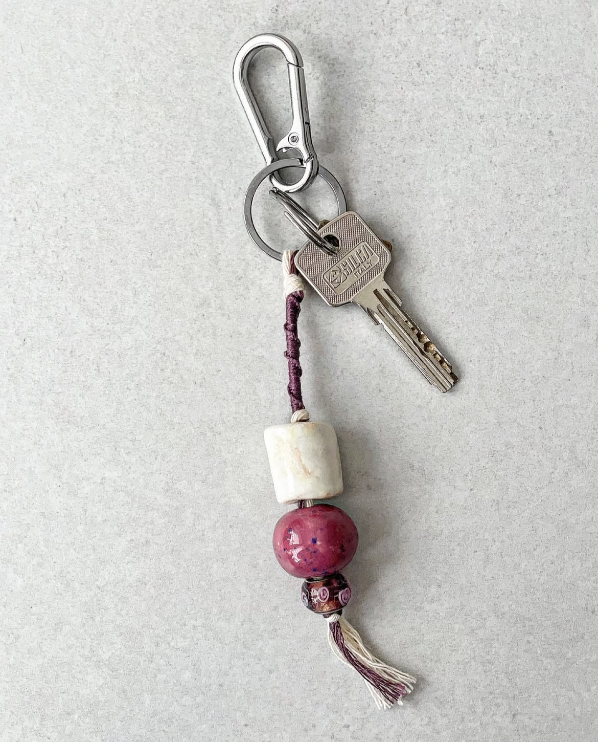 Ręcznie pleciony brelok, z ceramicznymi koralikami. Z zapięciem typu karabińczyk.