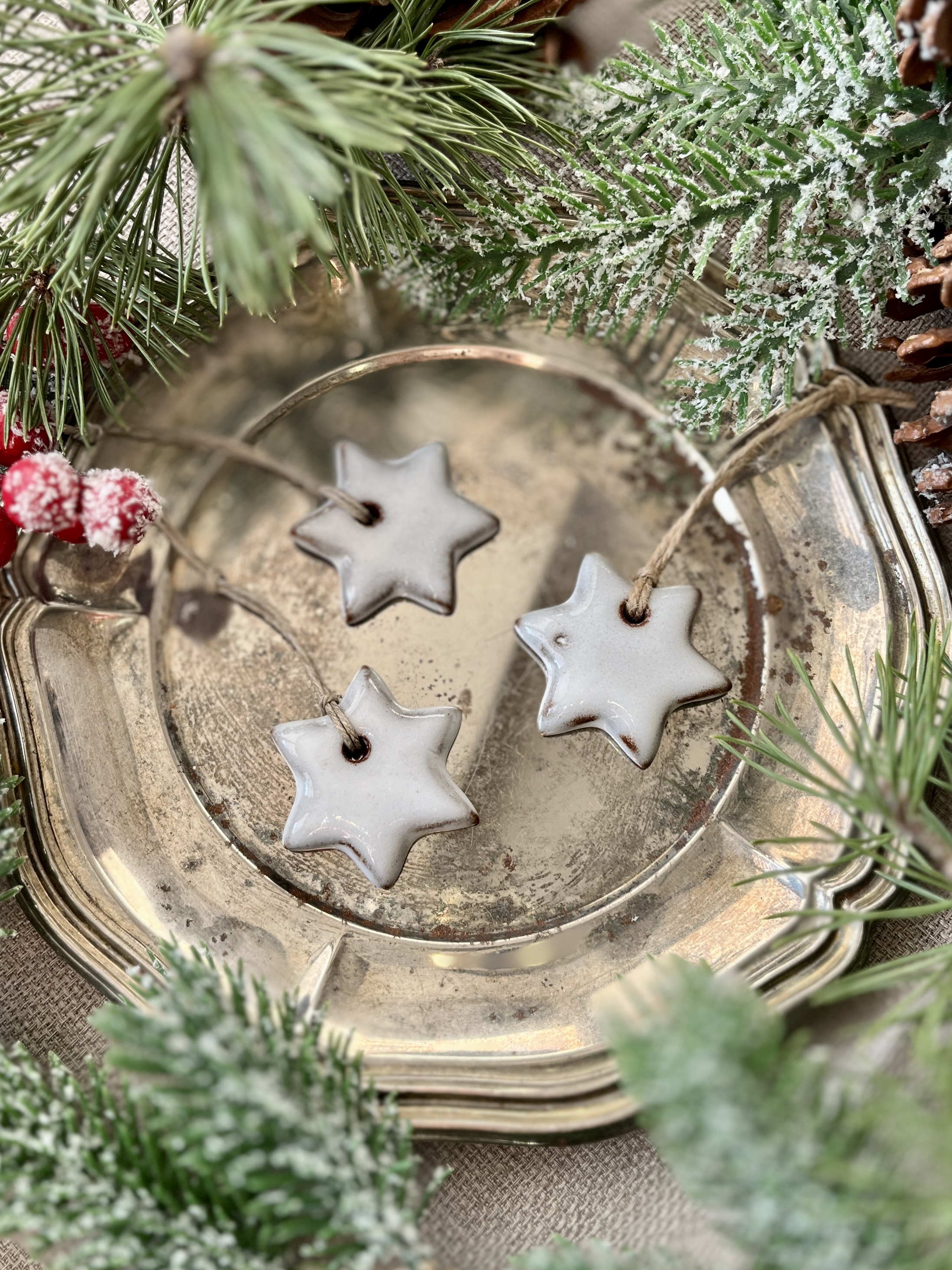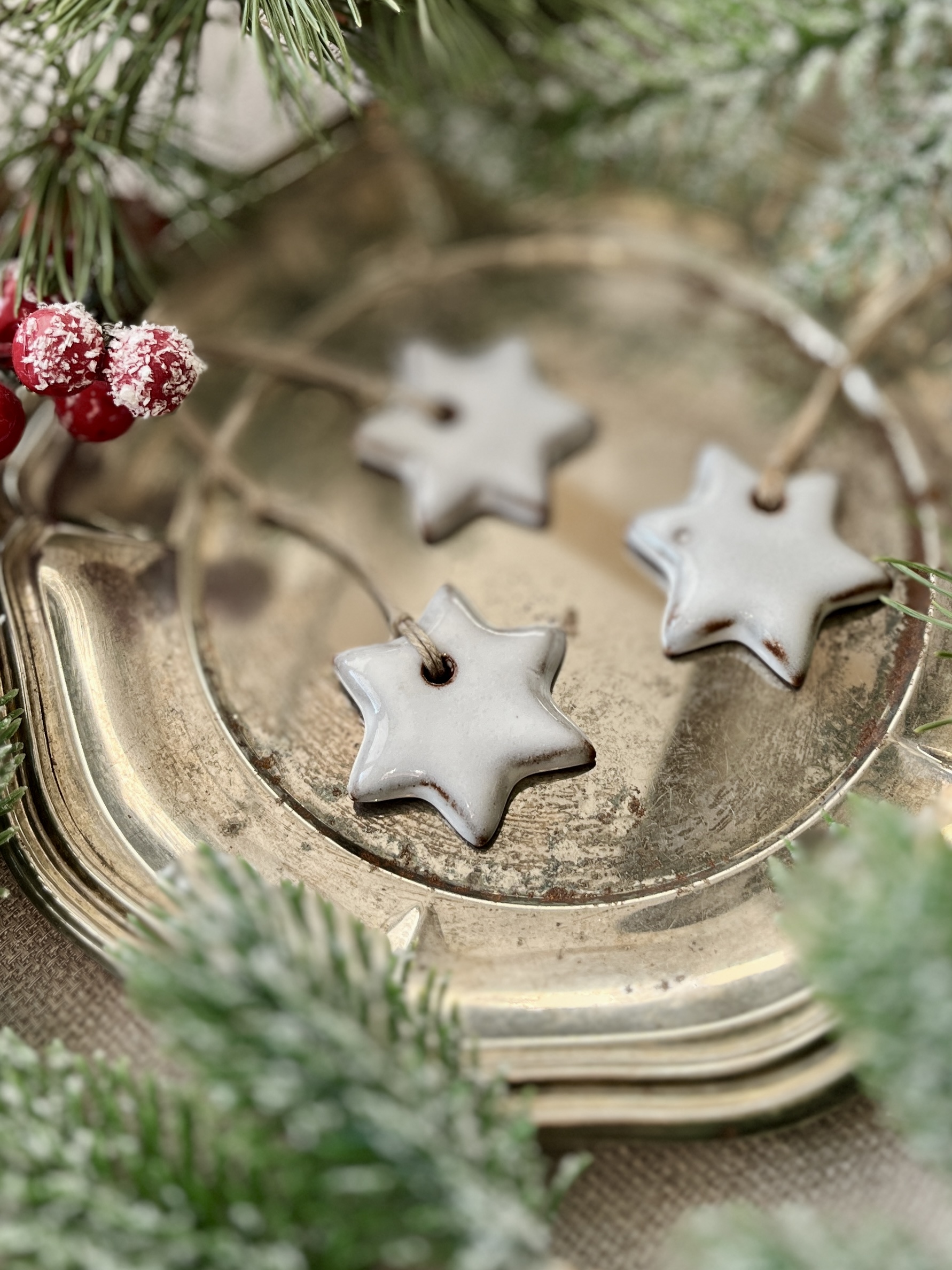 Zawieszka w kształcie gwiazdki, wykonana ręcznie z gliny. W kolorze białym.
