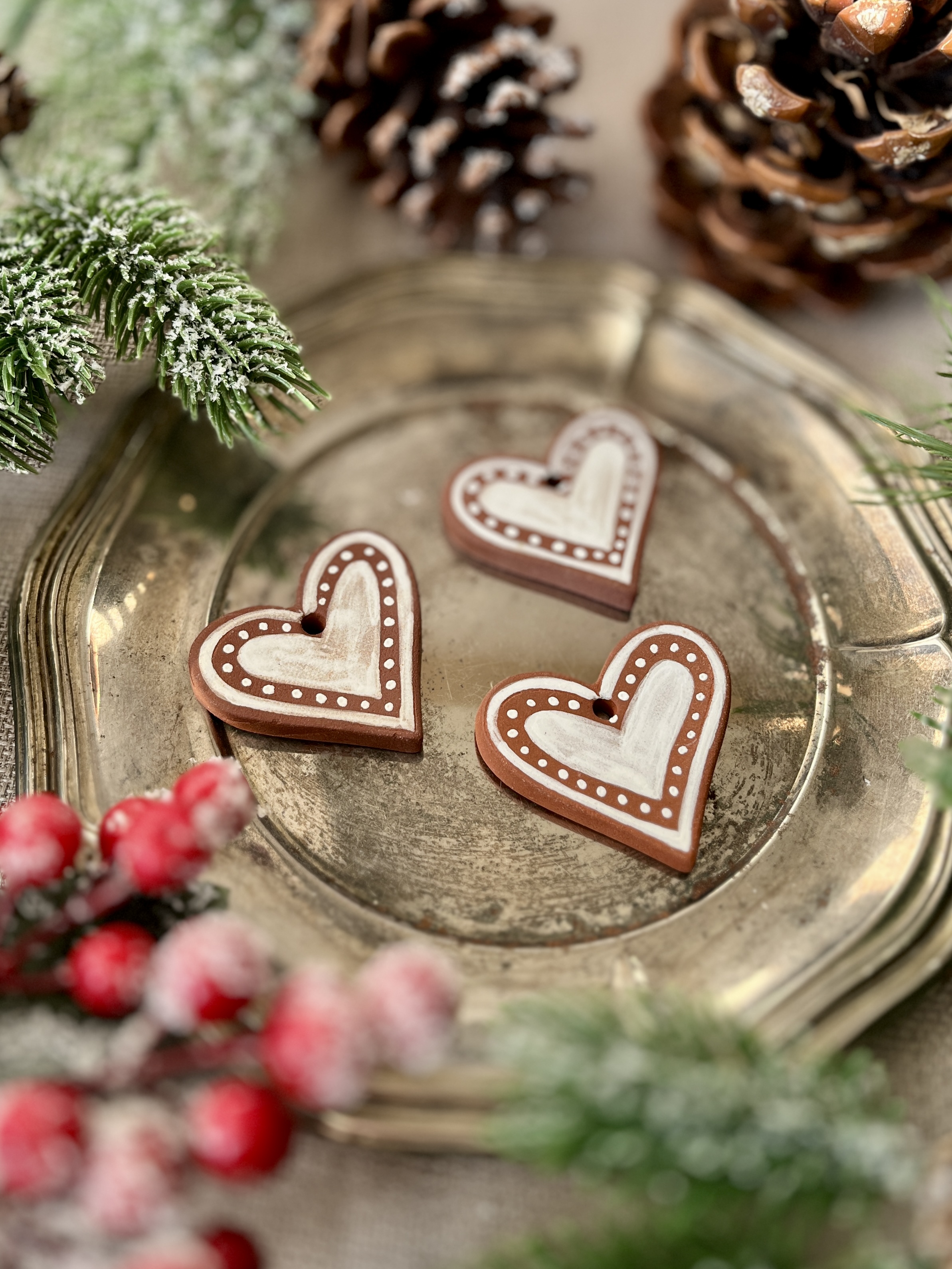Ceramiczna ozdoba choinkowa wykonana ręcznie z ciemnej gliny, w kształcie serca. Z ręcznie malowanym wzorem przypominającym pierniczka.