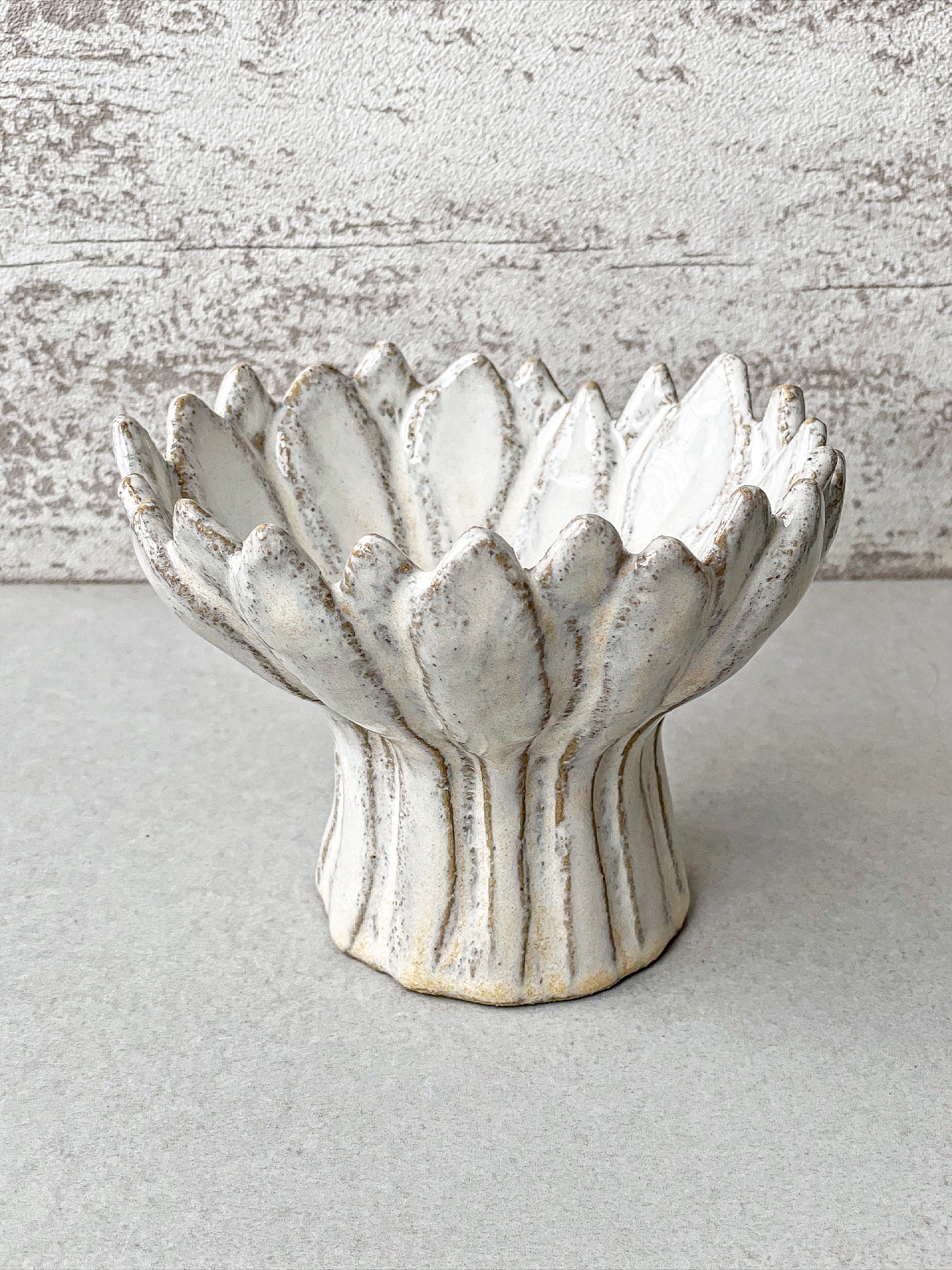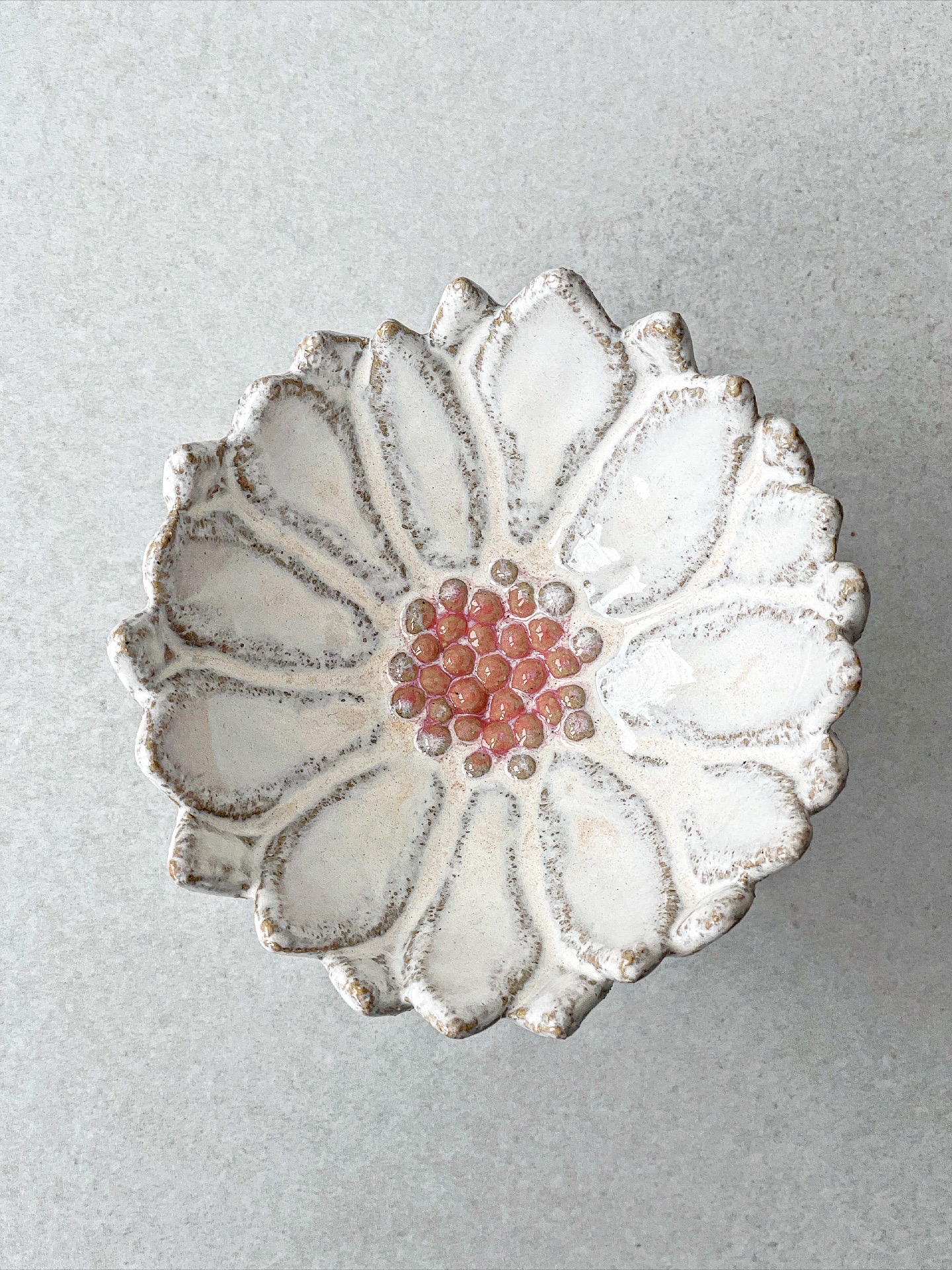 Ceramiczny kwiat wykonany z jasnej gliny. Może być stosowany np jako miseczka na sosy, czy przekąski lub jako dekoracja np miseczka na biżuterię.