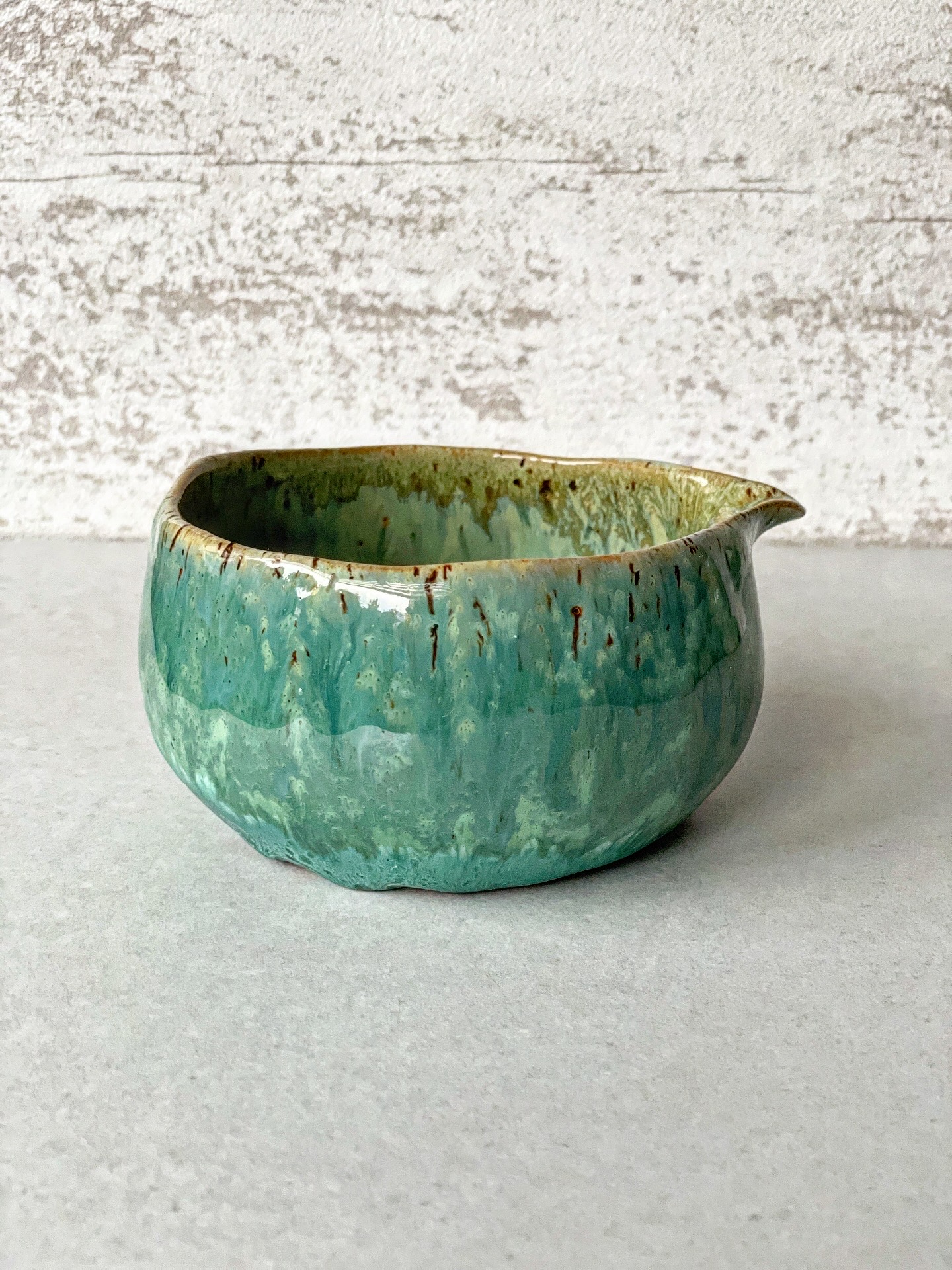 Miseczka z dzióbkiem do przyrządzania herbaty matcha. Wykonana ręcznie z jasnej gliny.