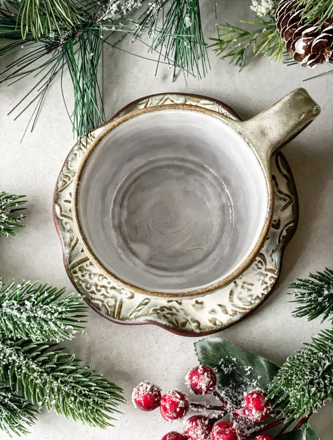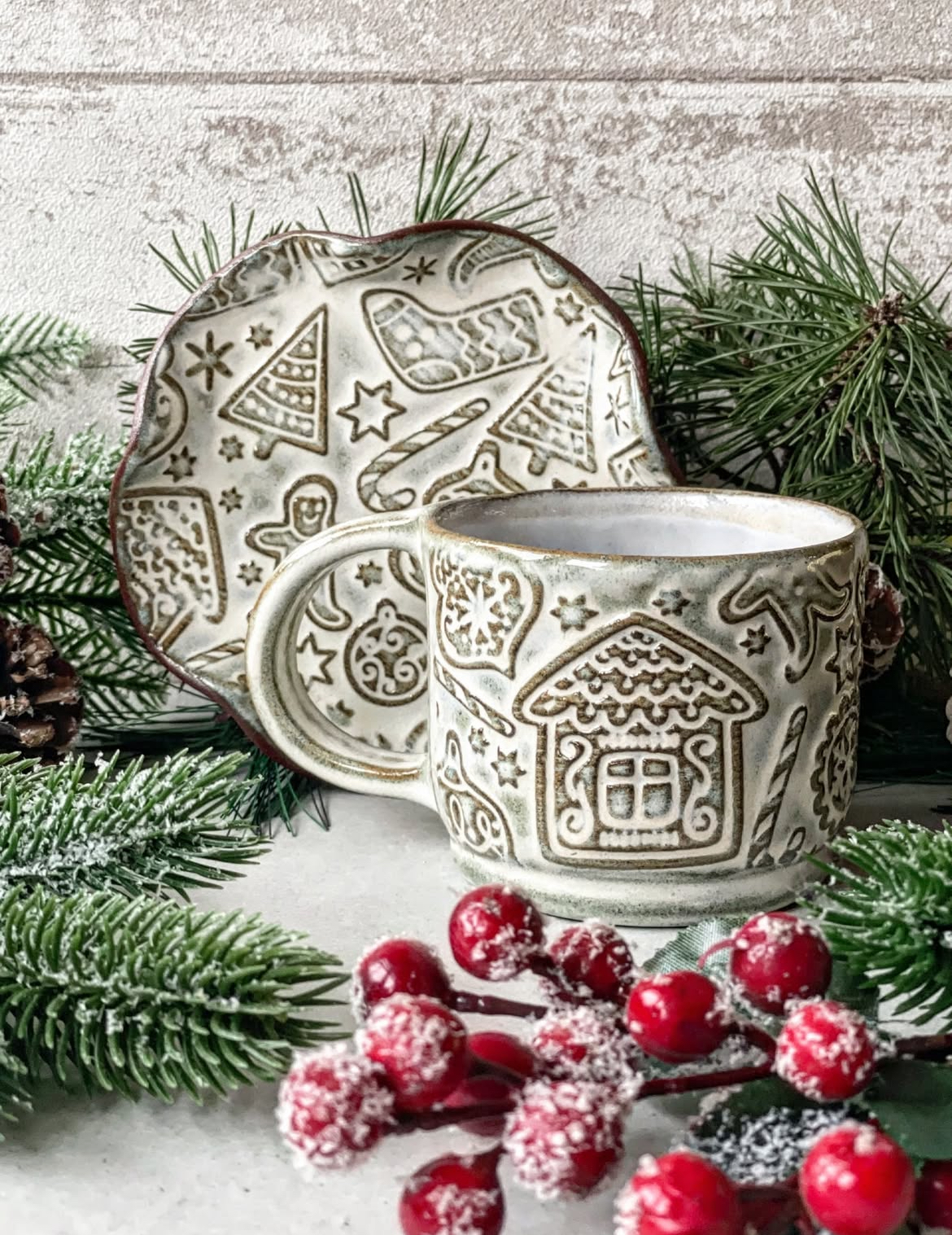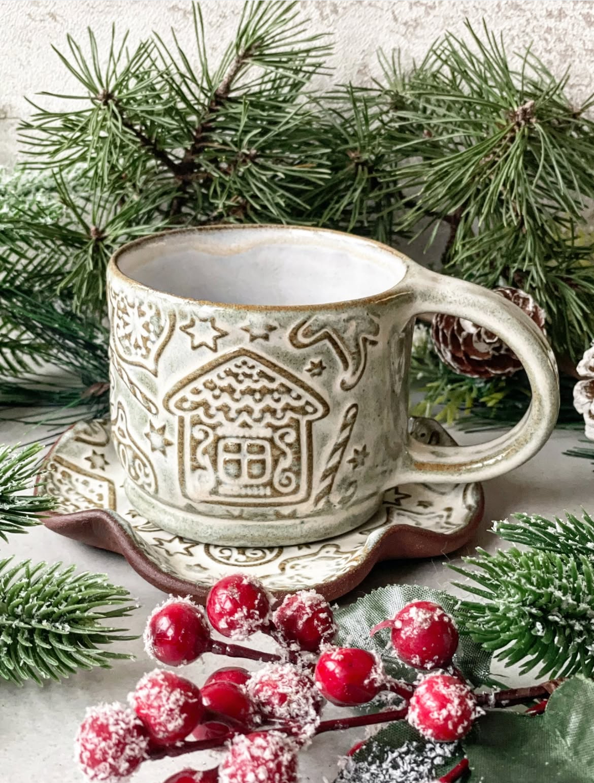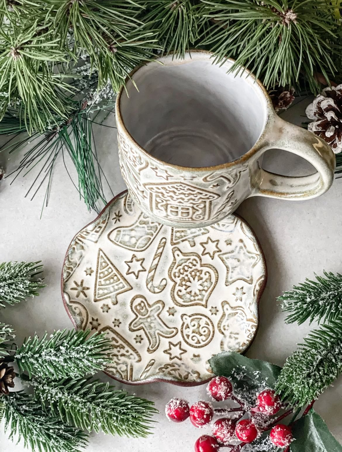 Ręcznie lepiony zestaw kubek z talerzykiem, wykonany z ciemnej gliny. Ze świątecznym wzorem.