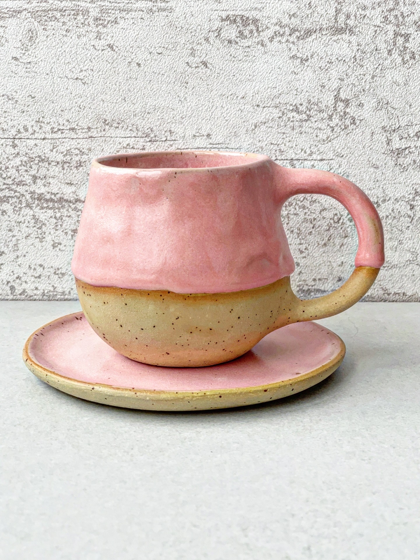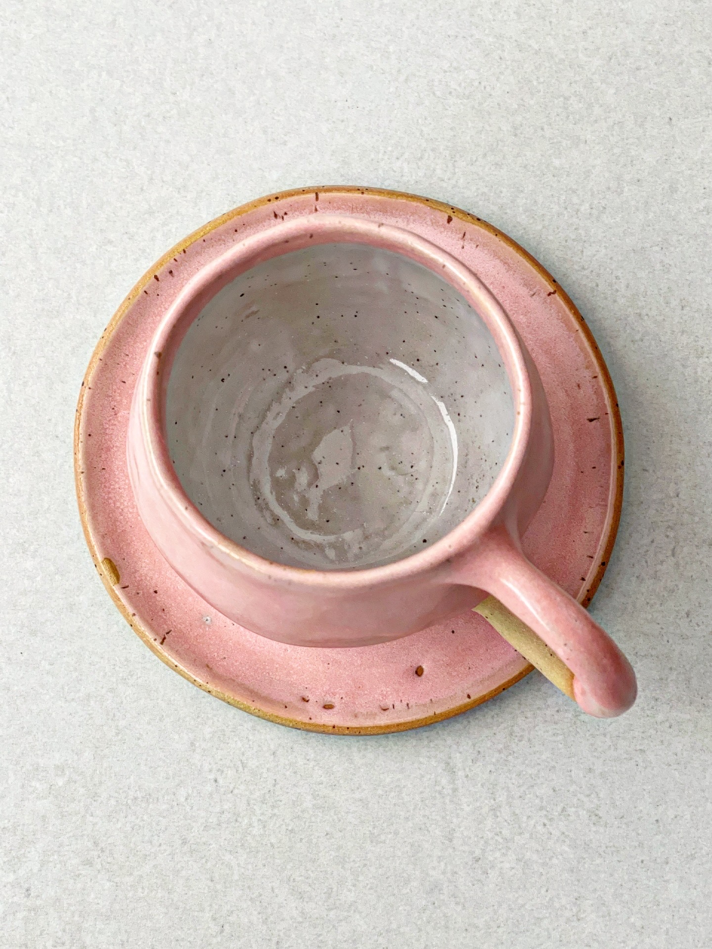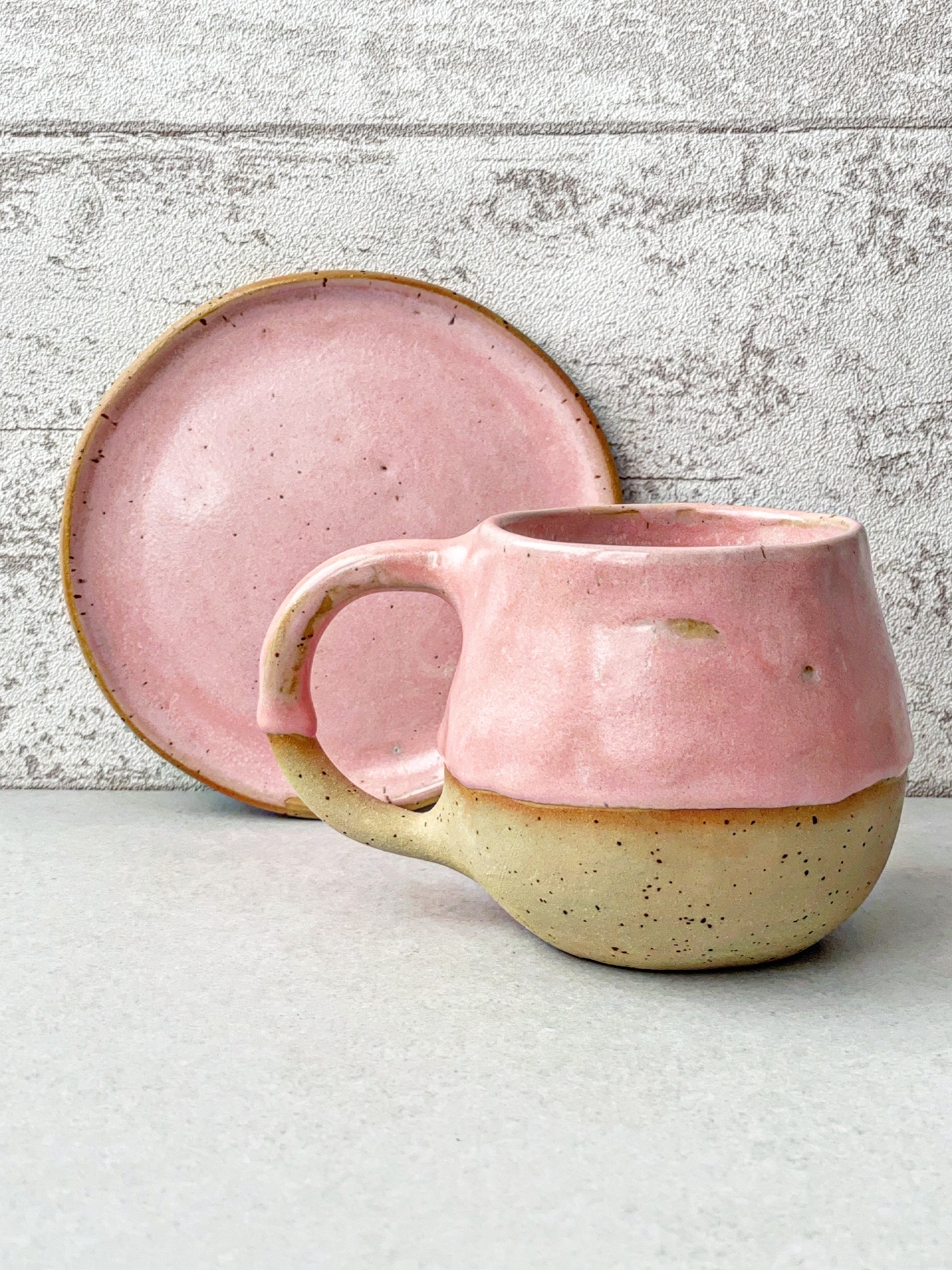 Komplet kubek + talerzyk wykonany ręcznie z jasnej kropkowej gliny. Poszkliwiony na kolor różowy.