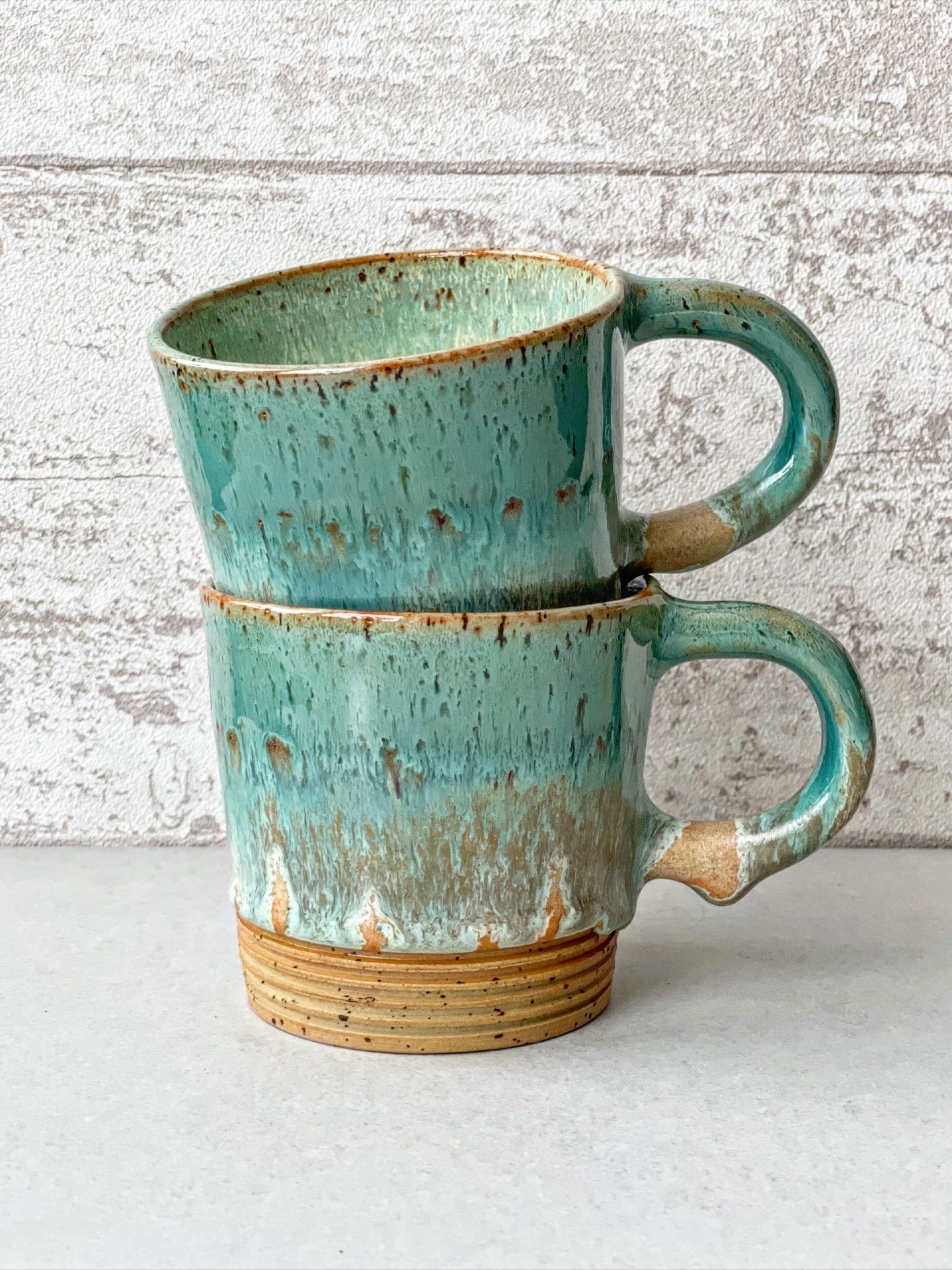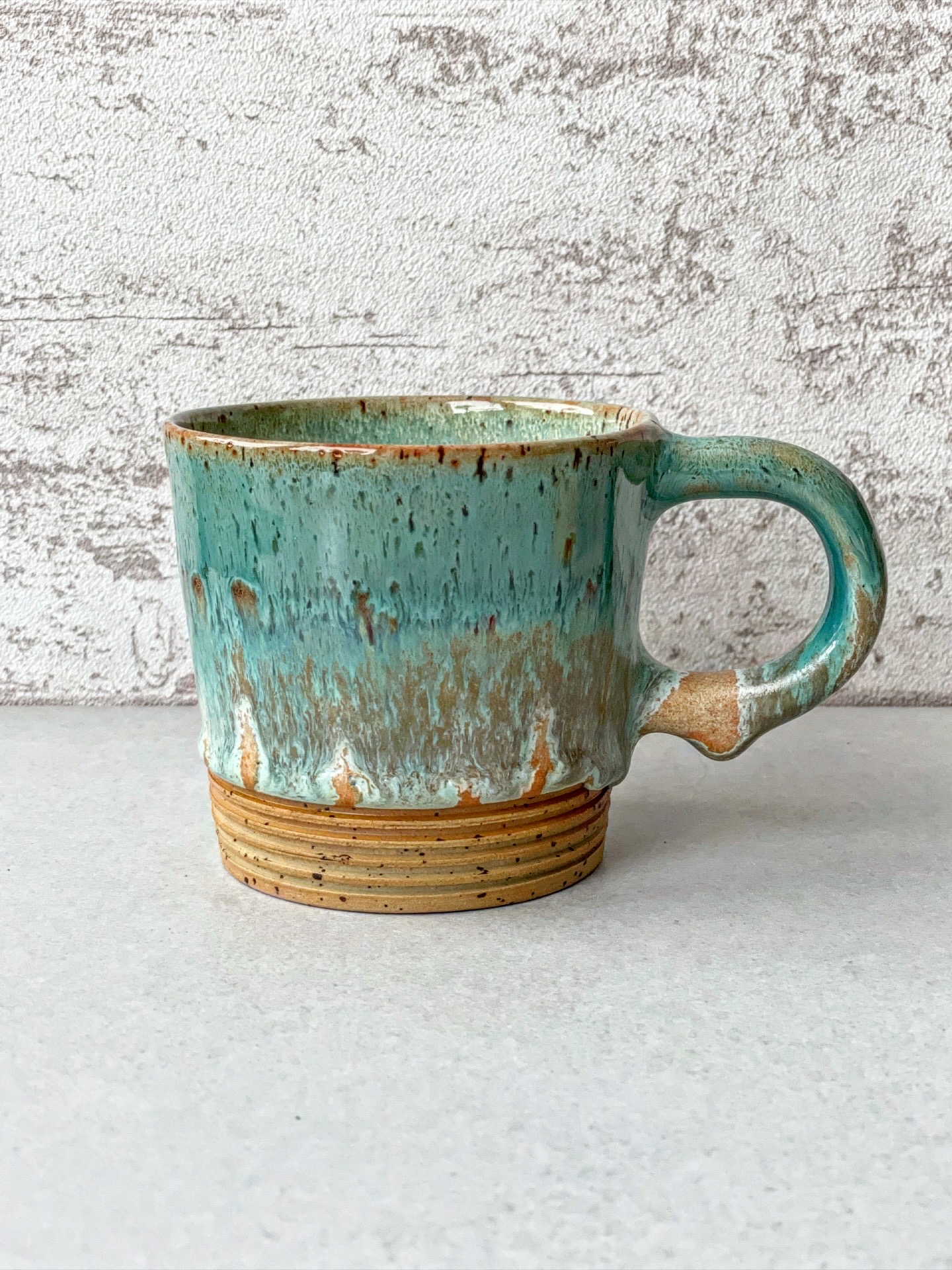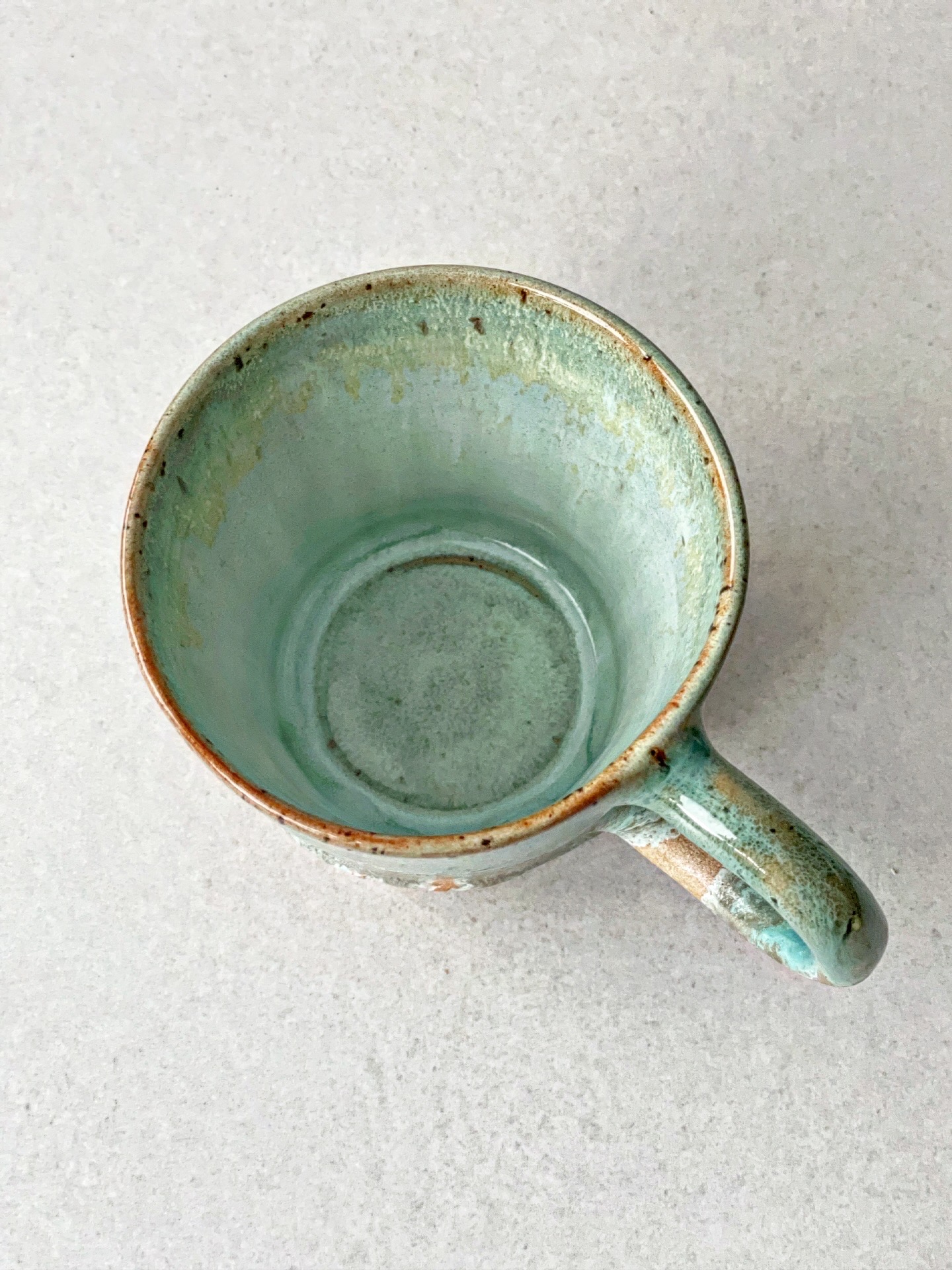 Kubek ceramiczny, wykonany na kole z jasnej gliny.