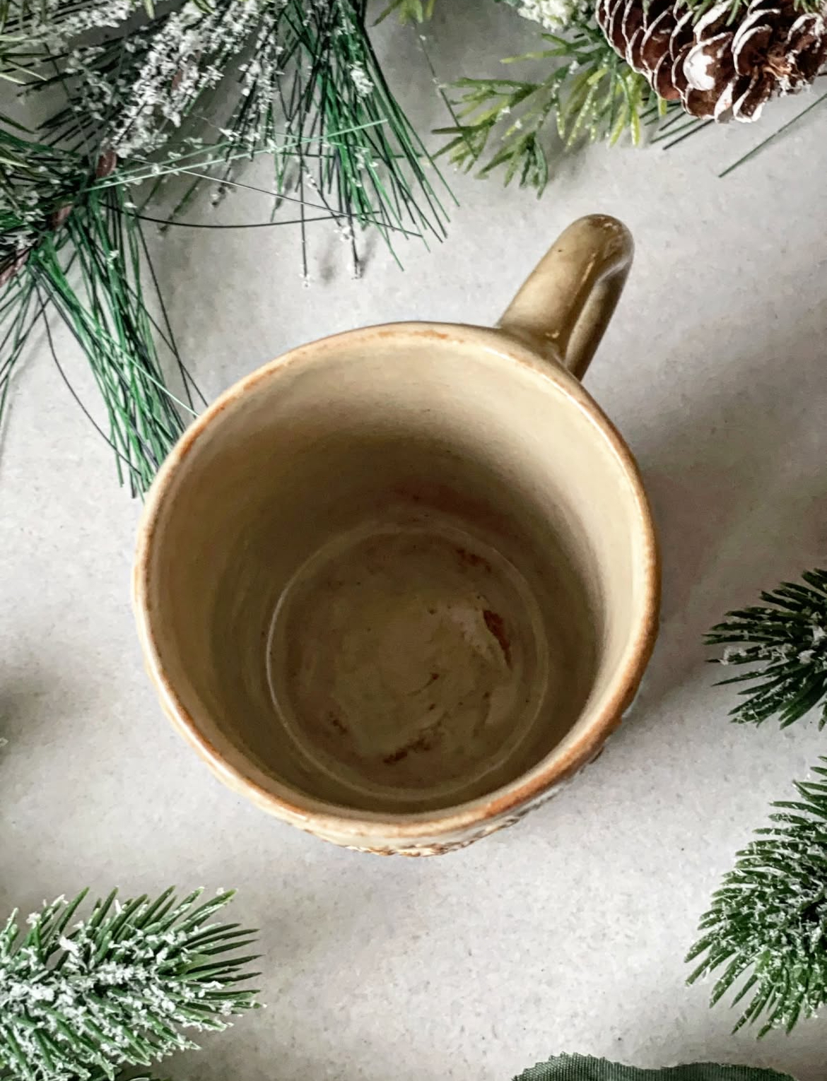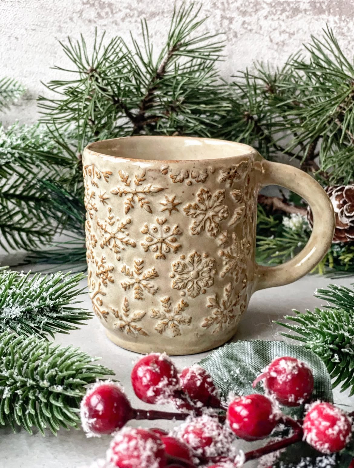 Ręcznie lepiony kubek, wykonany z jasnej gliny. Ze wzorem w śnieżynki.