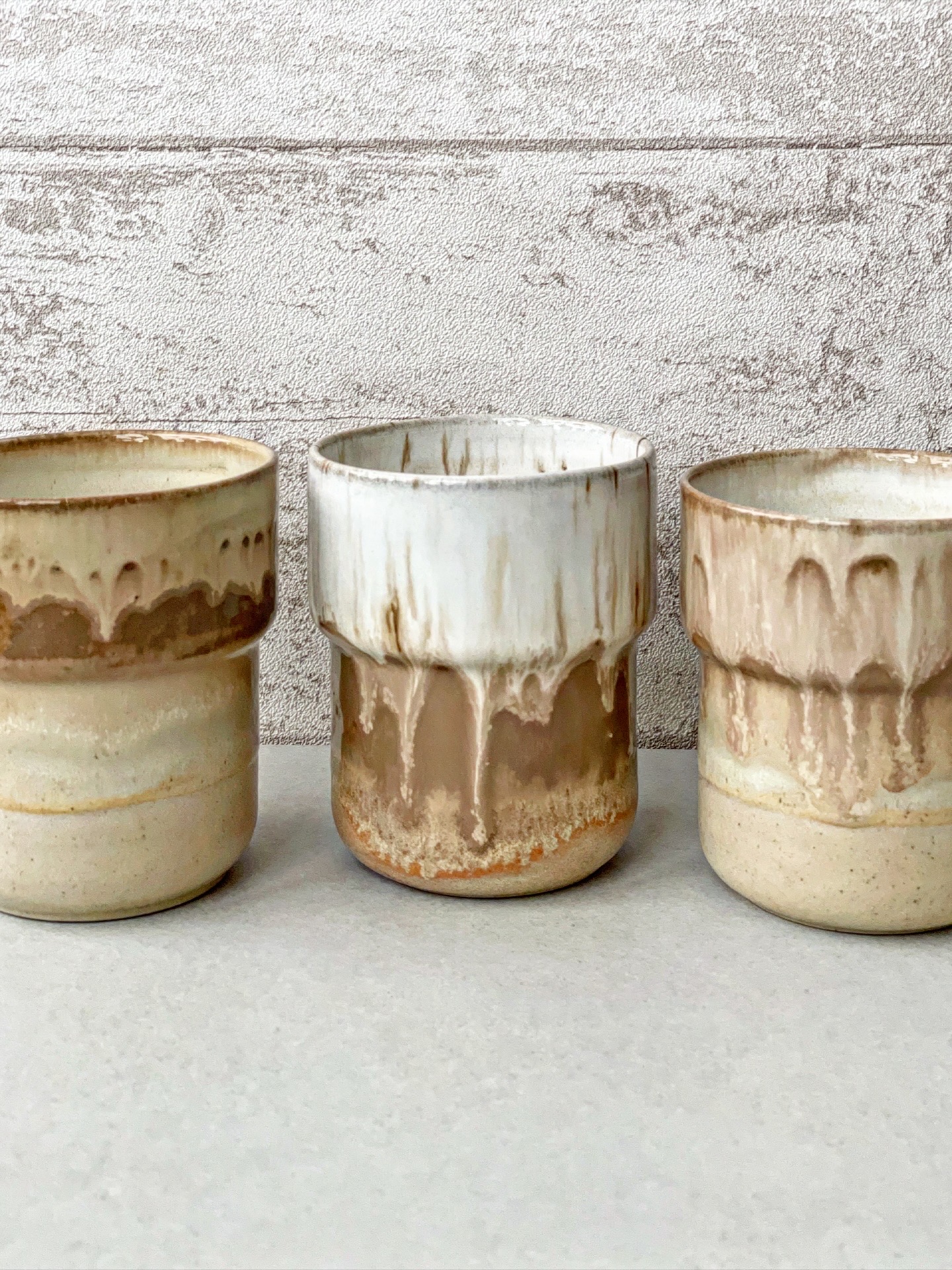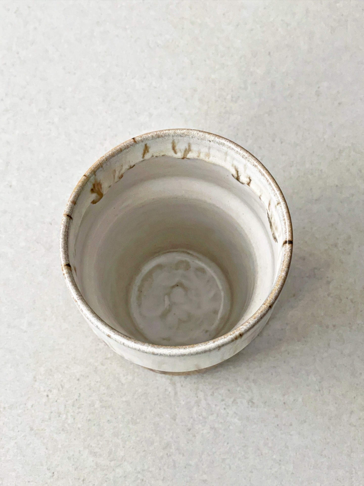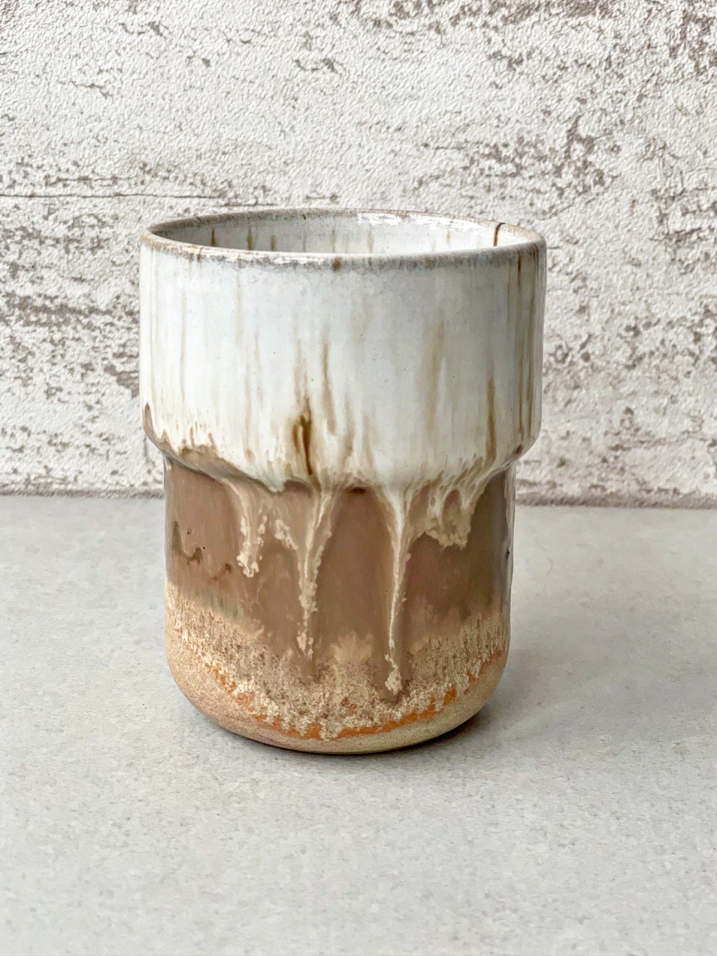 Kubek bez ucha, wykonany ręcznie na kole z jasnej gliny.