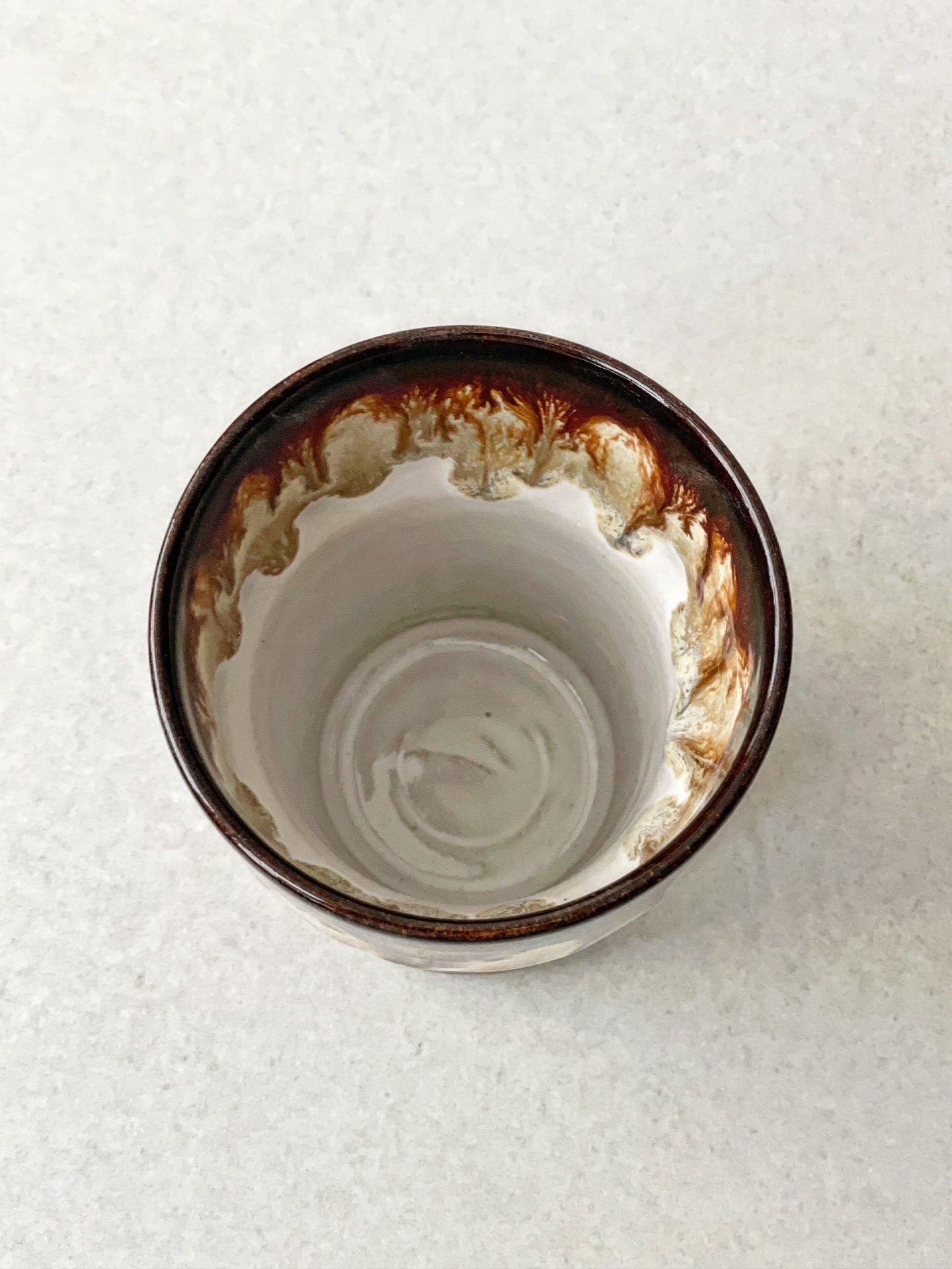 Kubek bez ucha, wykonany ręcznie na kole z jasnej gliny.