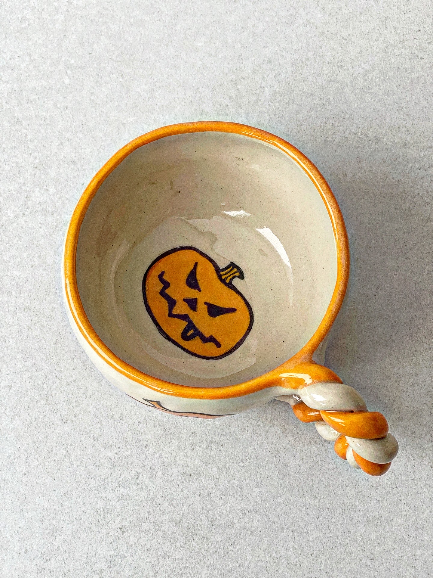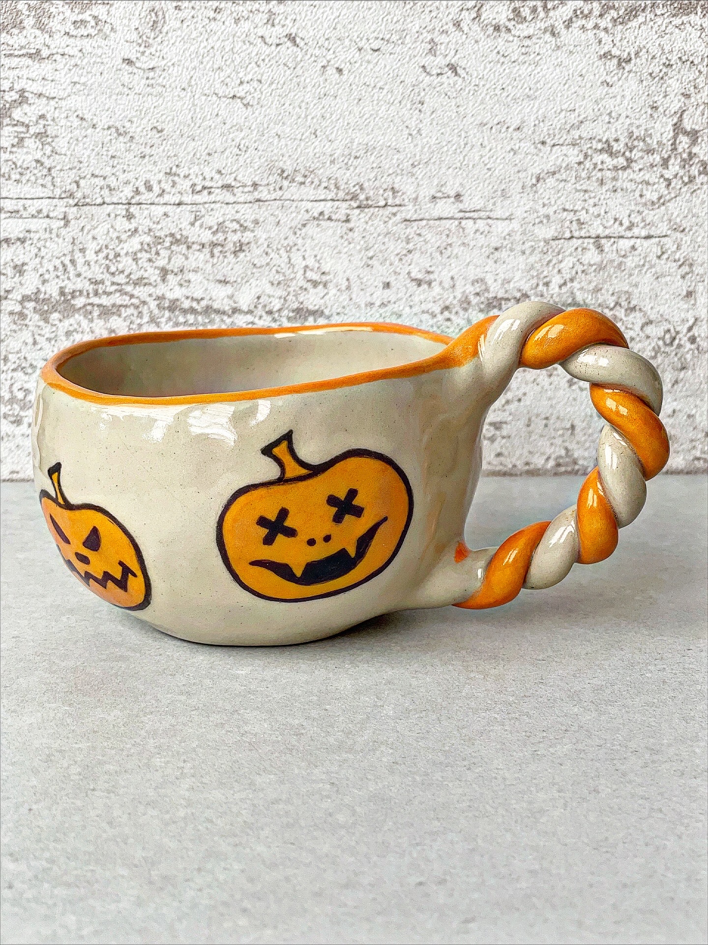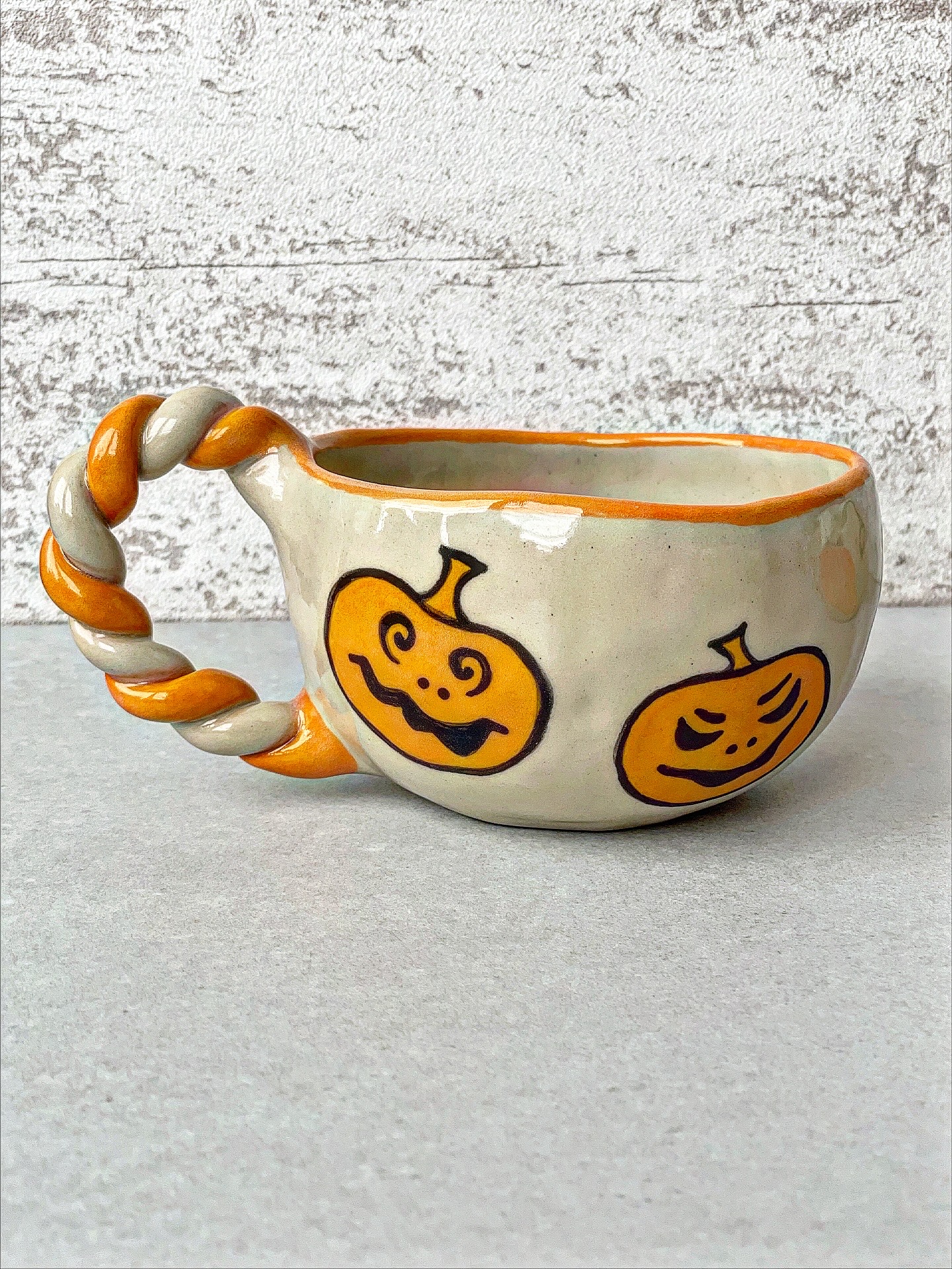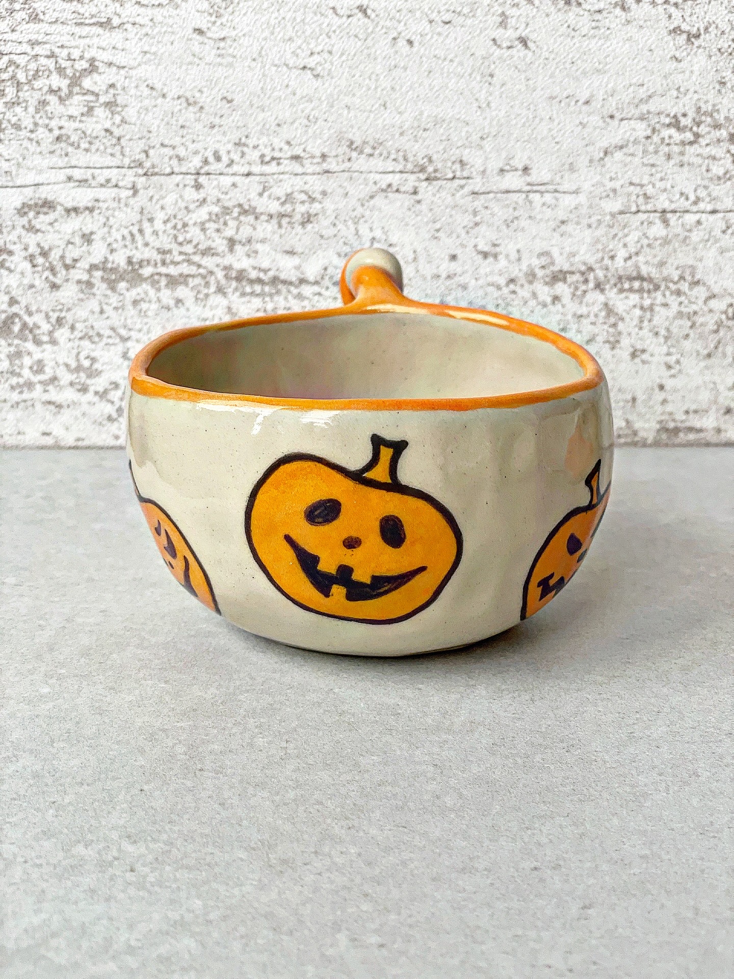 Kubek został wykonany z jasnej gliny. Z ręcznie malowanymi dyniami halloween.