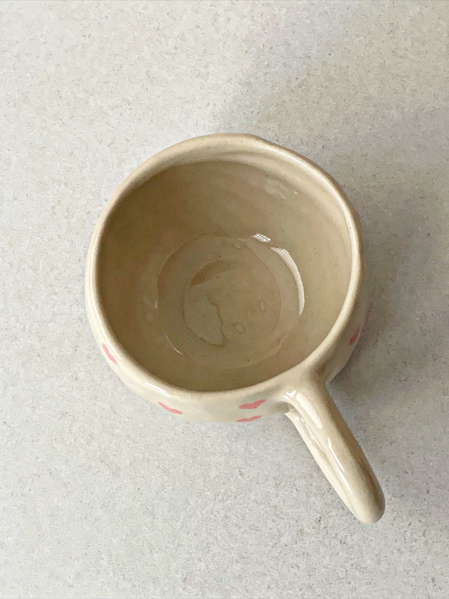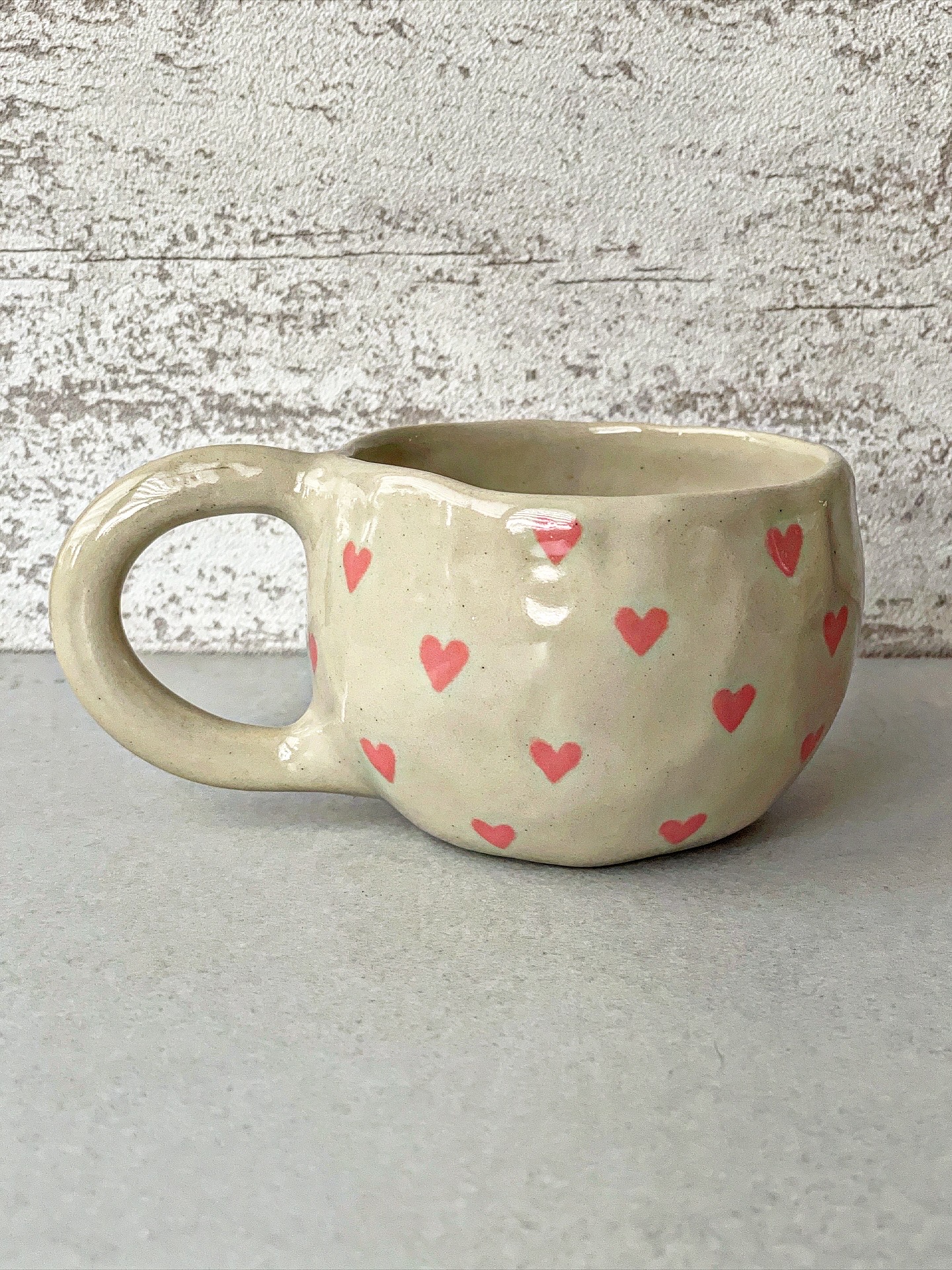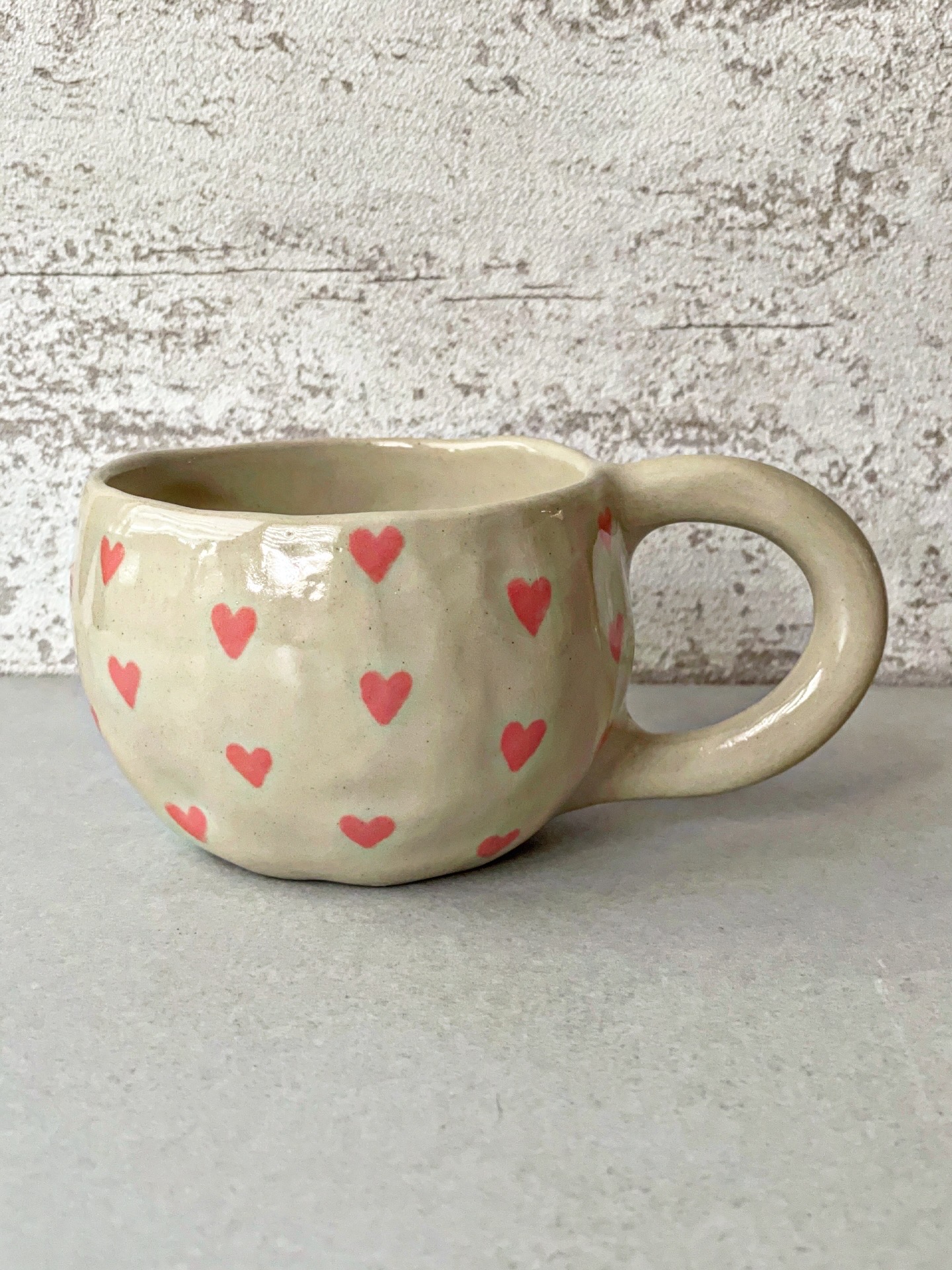 Kubek ceramiczny wykonany ręcznie z jasnej gliny. Z ręcznie malowanymi sercami.