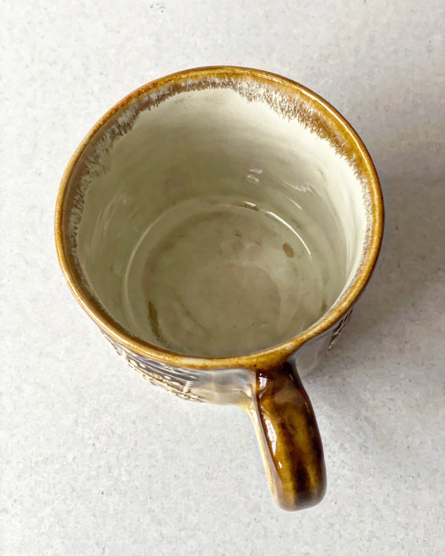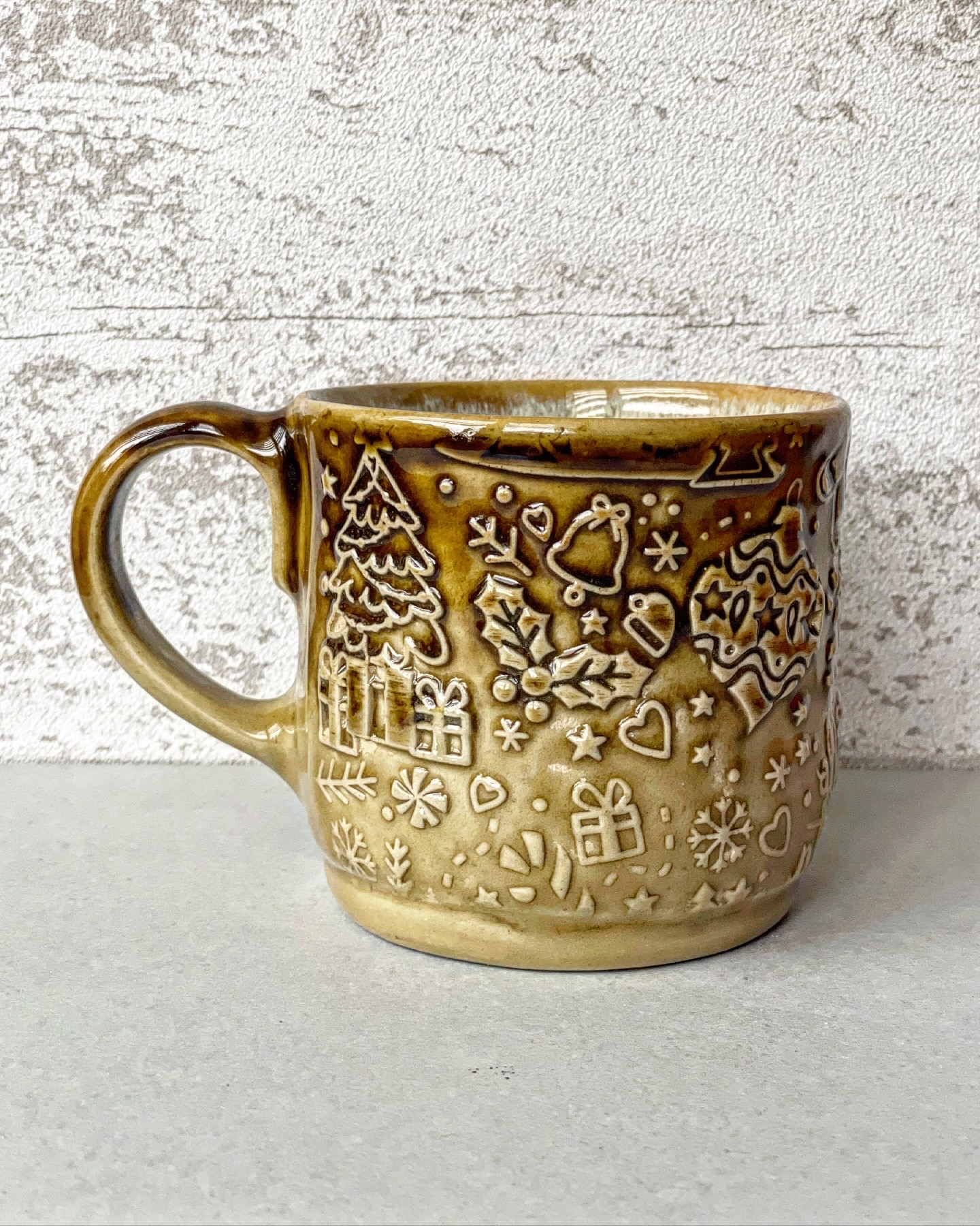 Kubek został ulepiony z płata jasnej gliny. Ze wzorem świątecznym, w kolorze miodowym.