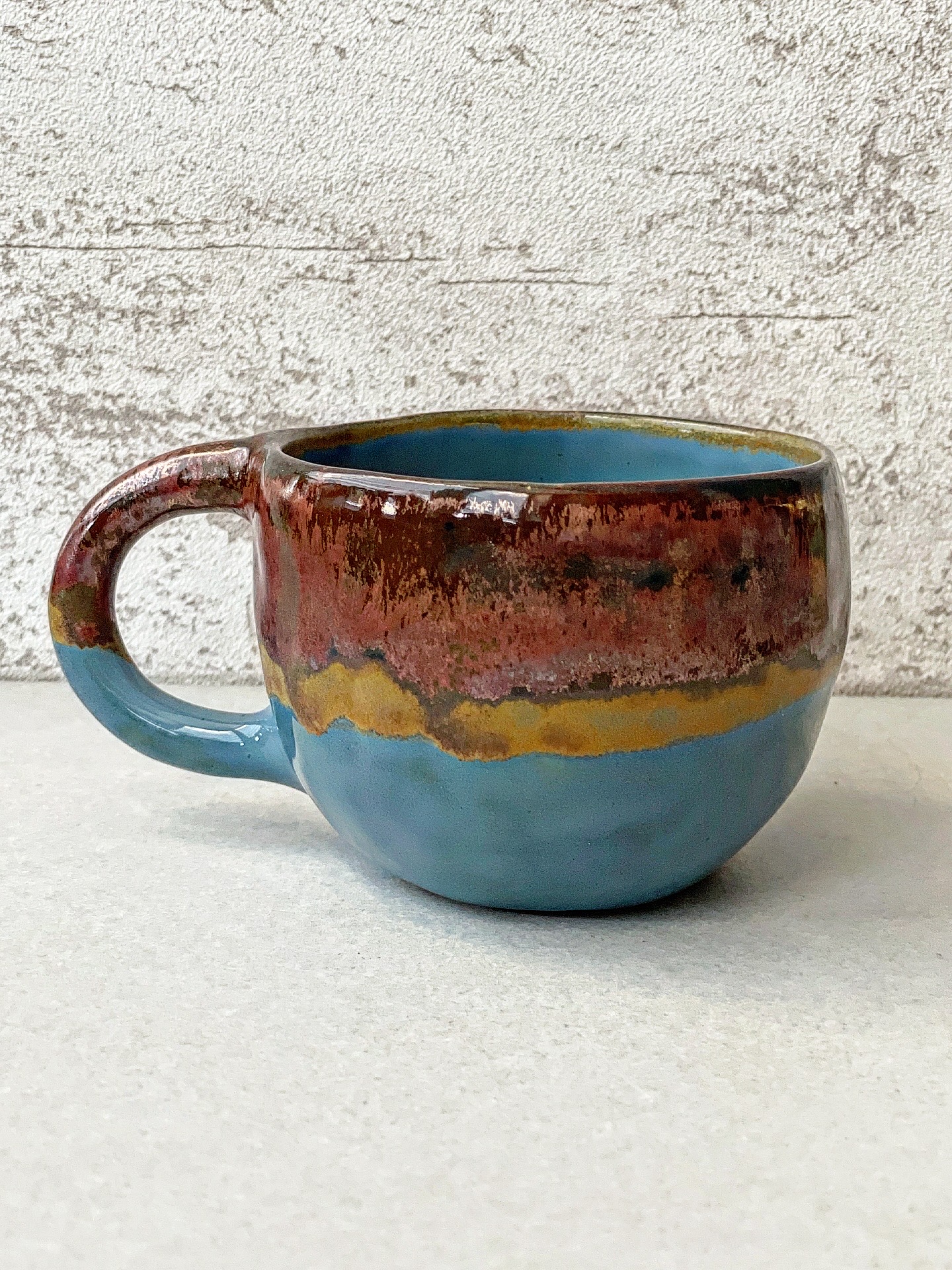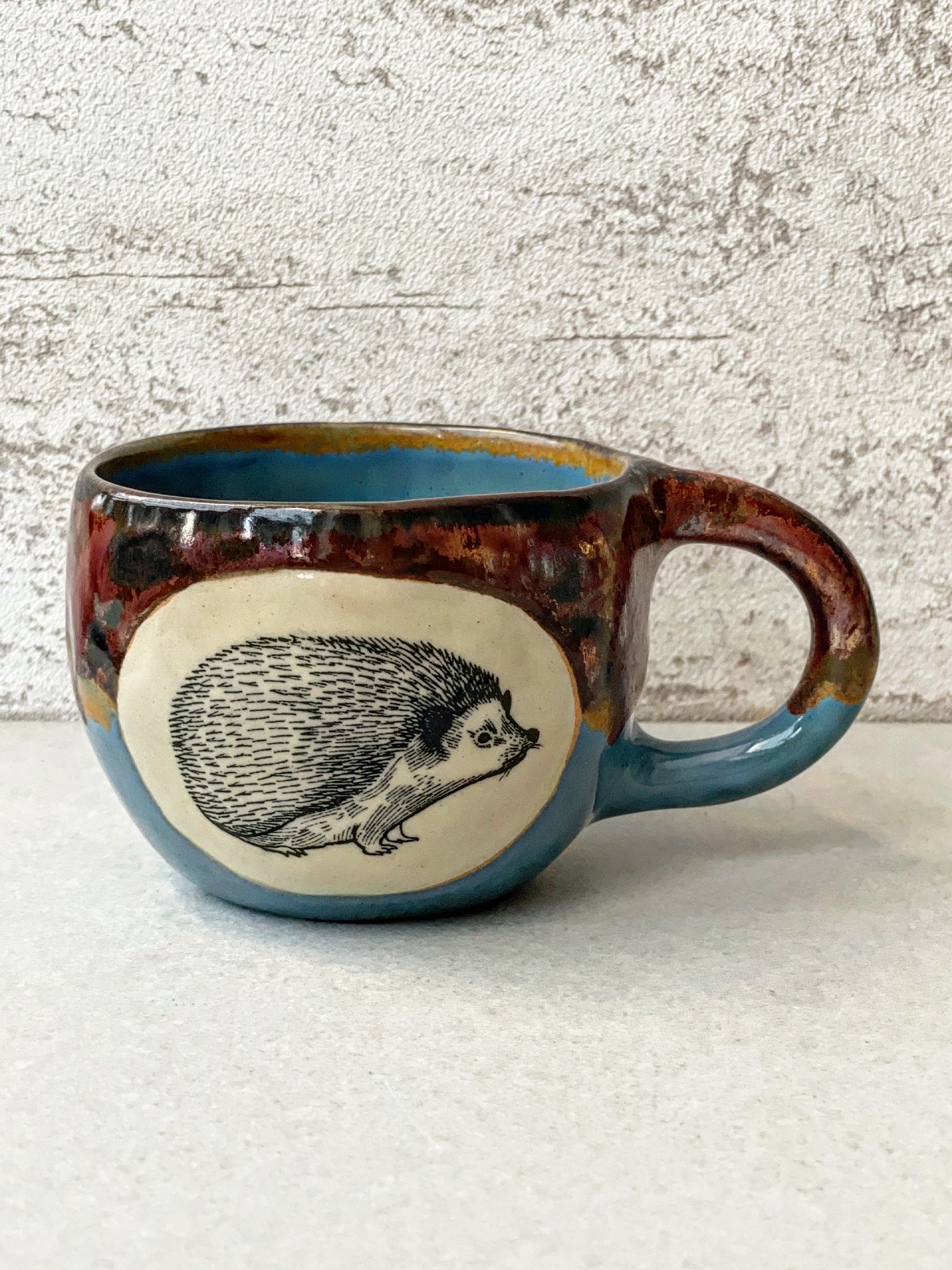 Ręcznie lepiony kubek ceramiczny wykonany z jasnej gliny. Pokryty szkliwami w kolorach niebiesko-rdzawych. Z rysunkiem jeża.