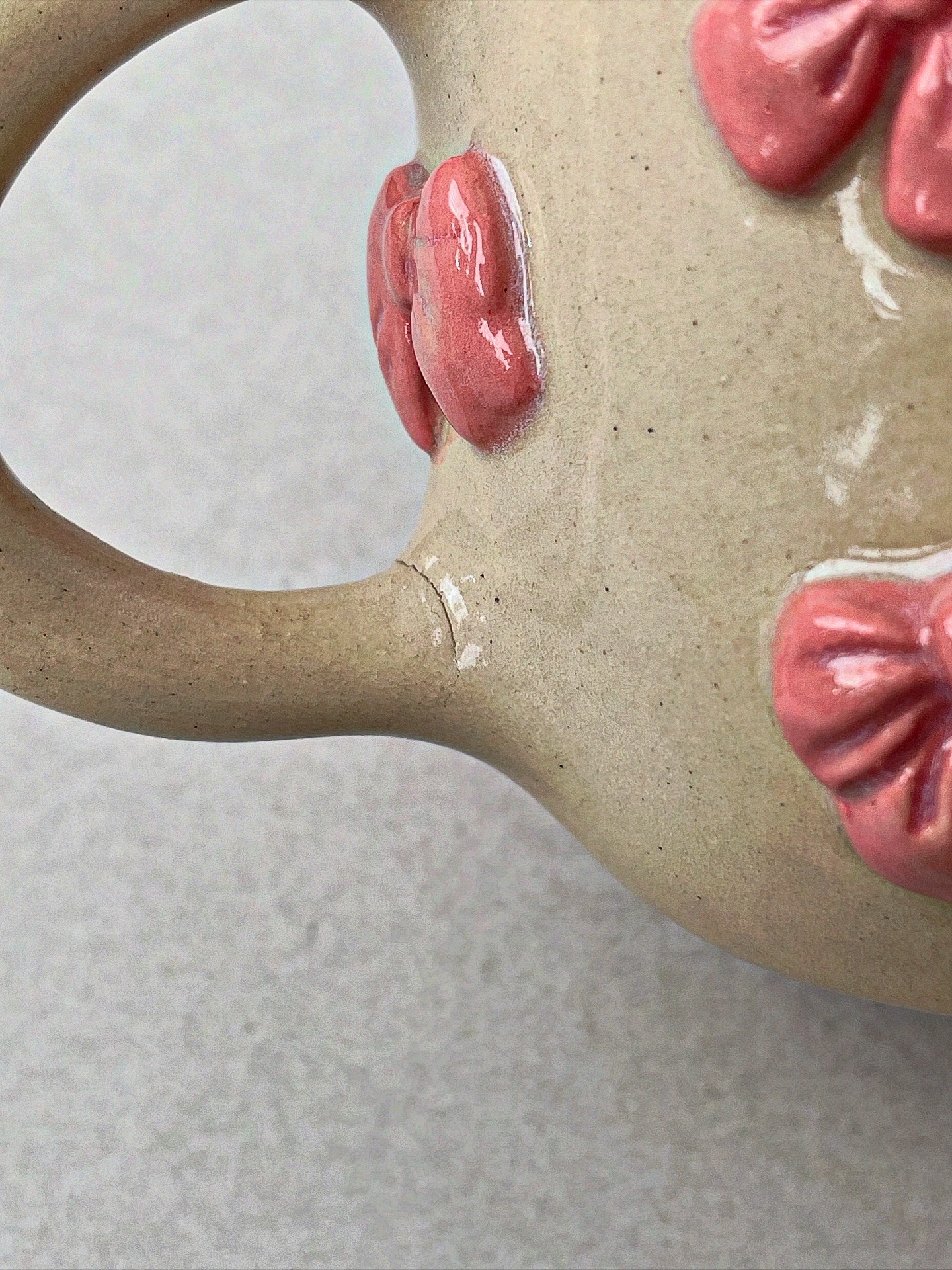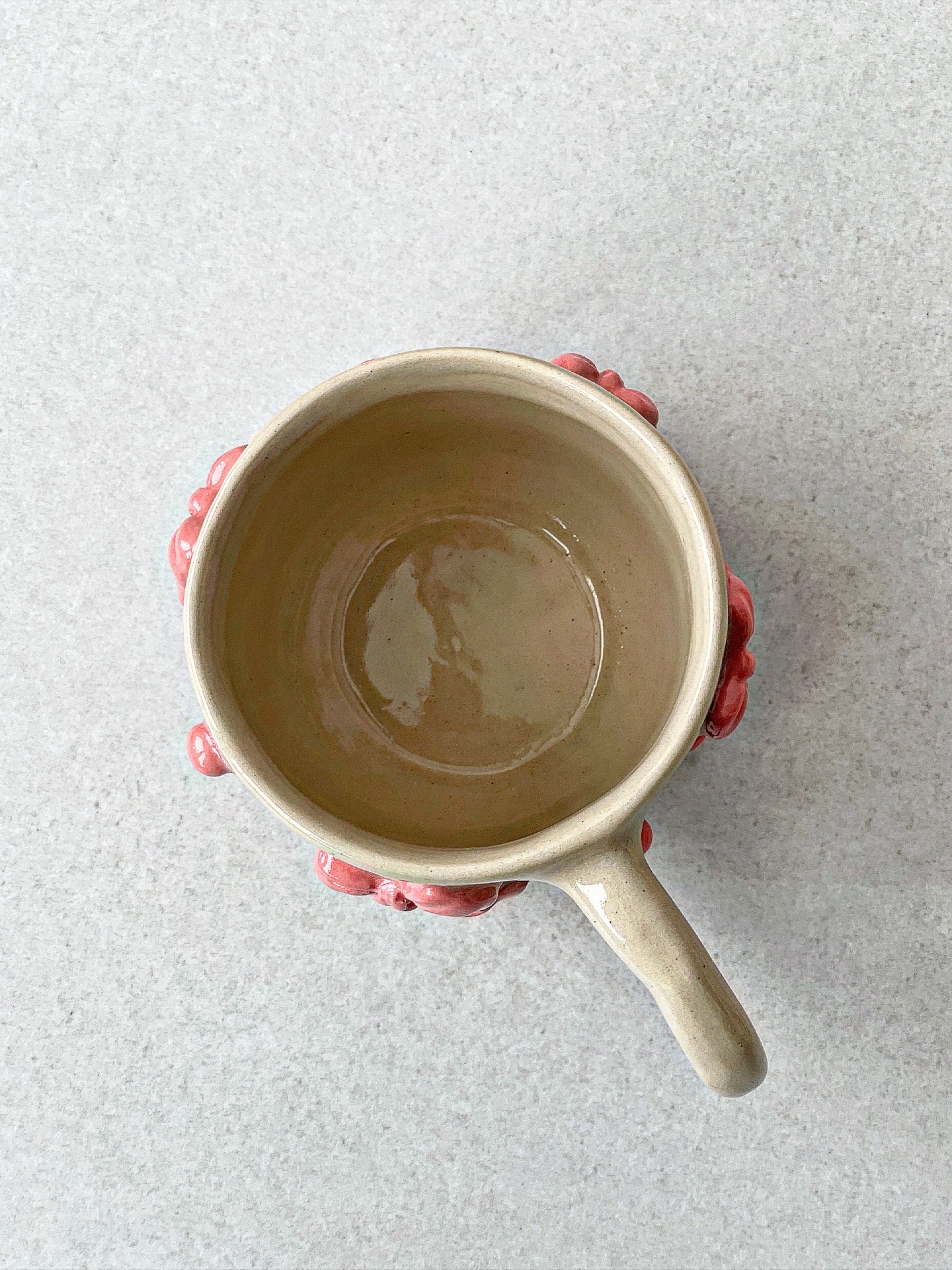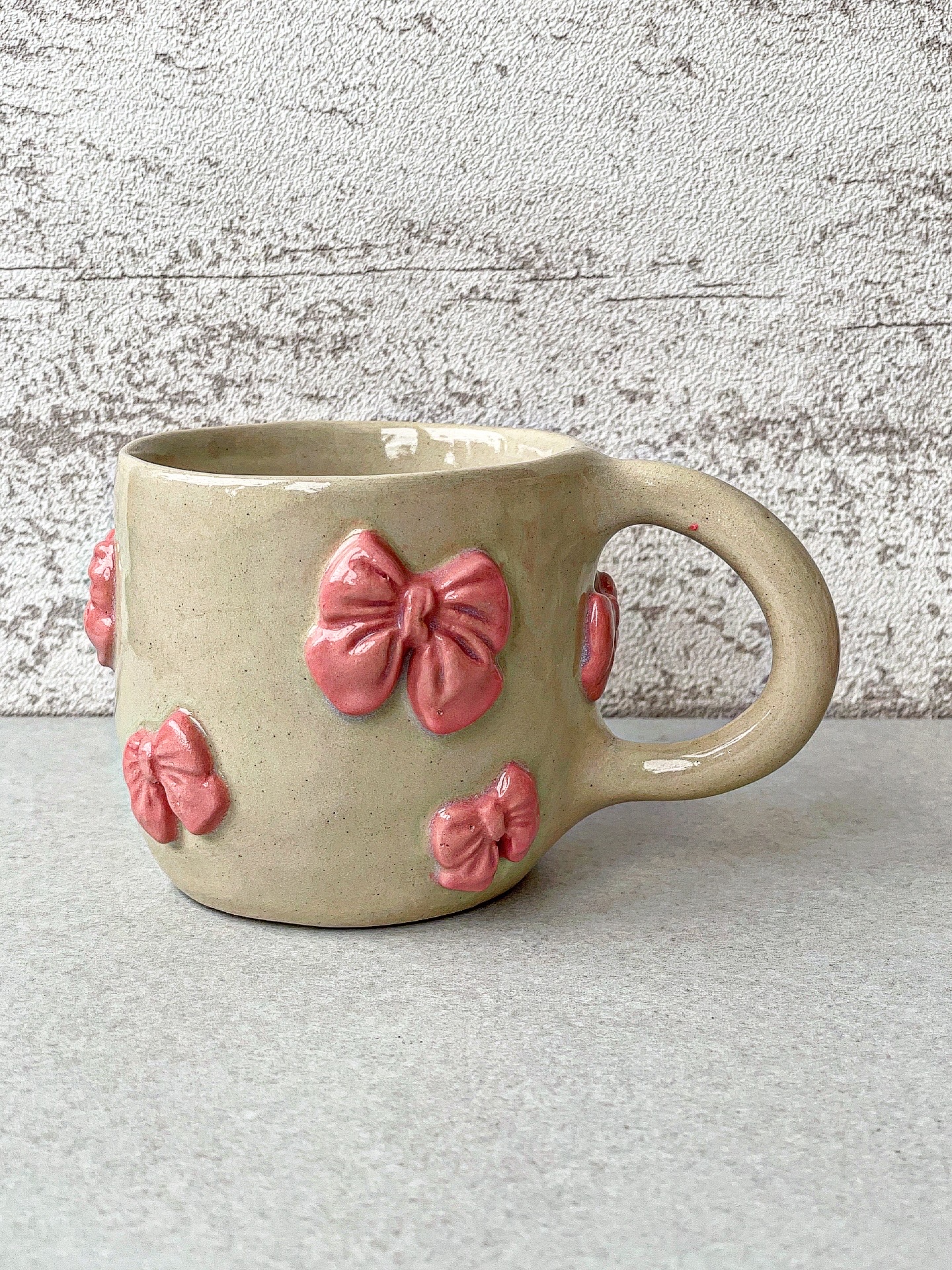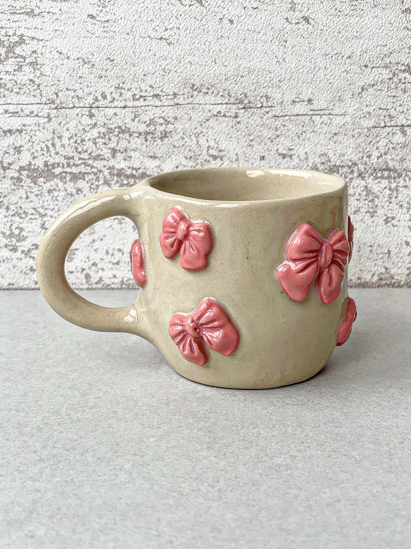 Kubek ceramiczny, ulepiony ręcznie z jasnej gliny. Z wypukłymi kokardkami.