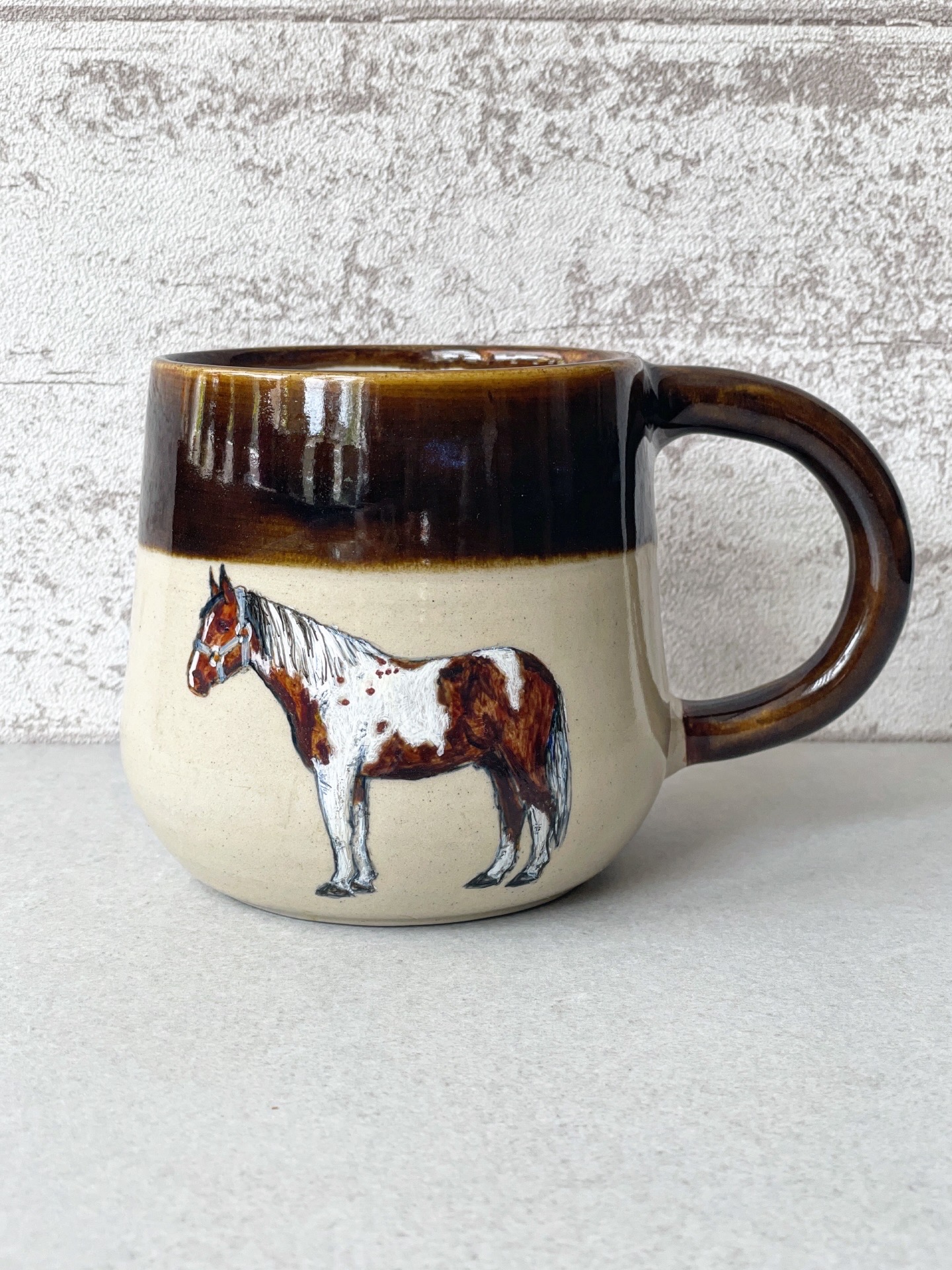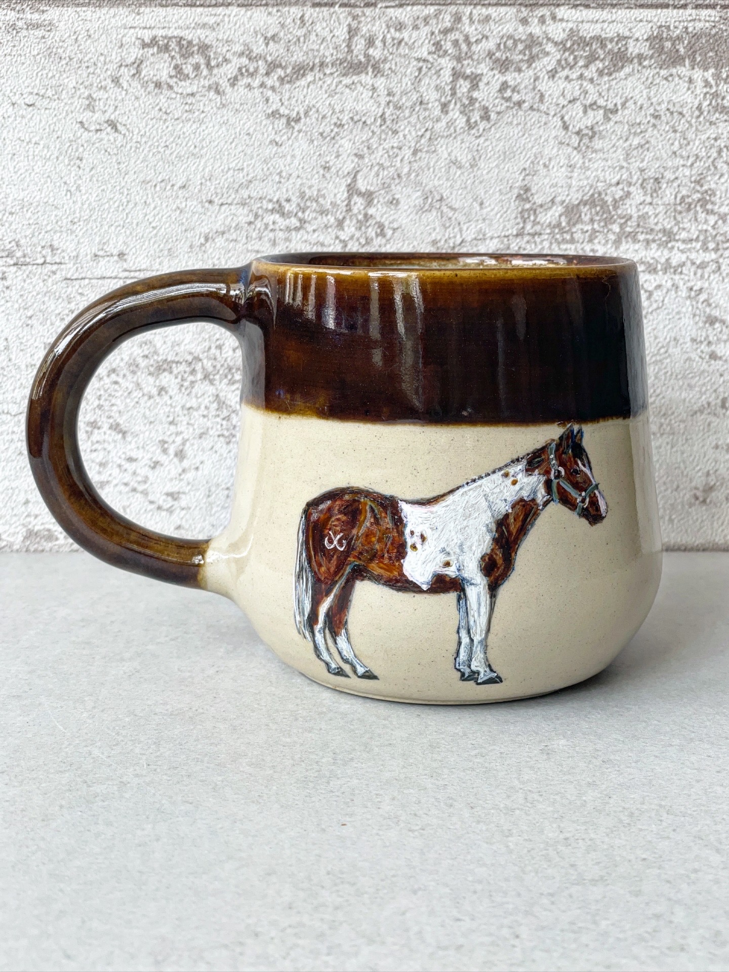 Kubek ceramiczny wykonany ręcznie z jasnej gliny, z ręcznie malowanym koniem.