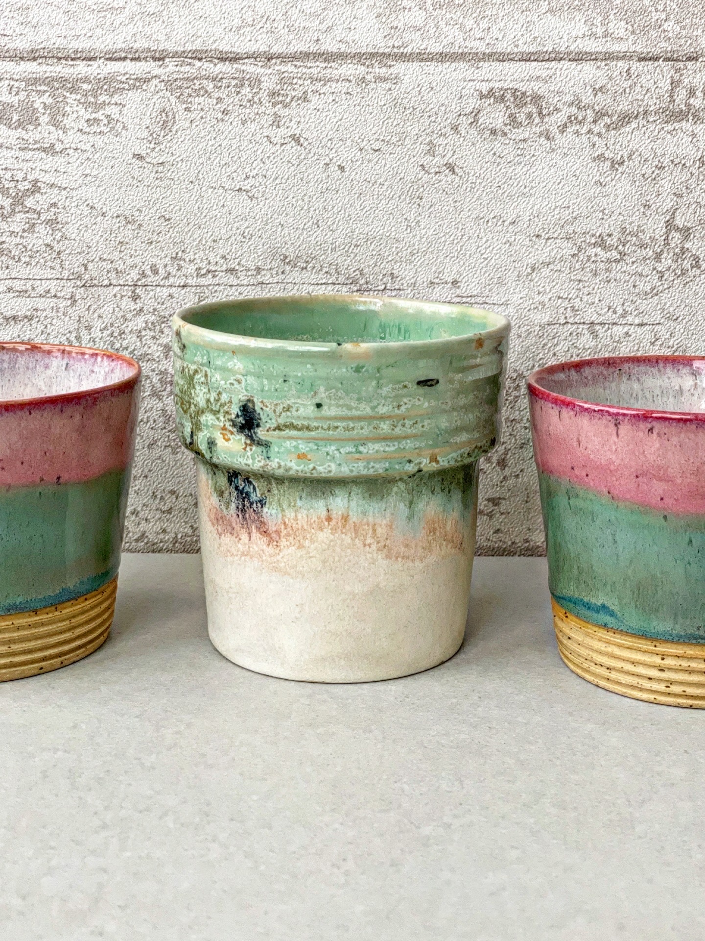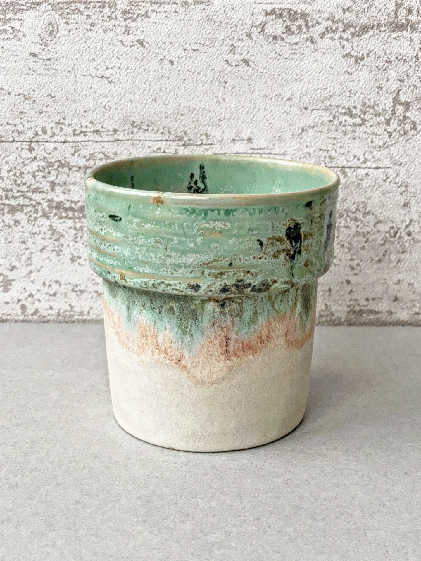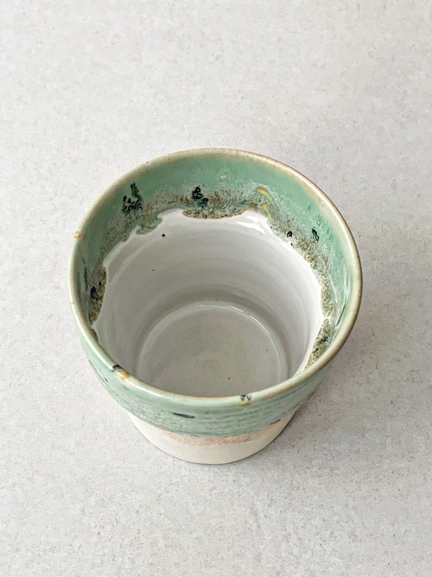 Kubek bez ucha, wykonany ręcznie na kole z jasnej gliny.