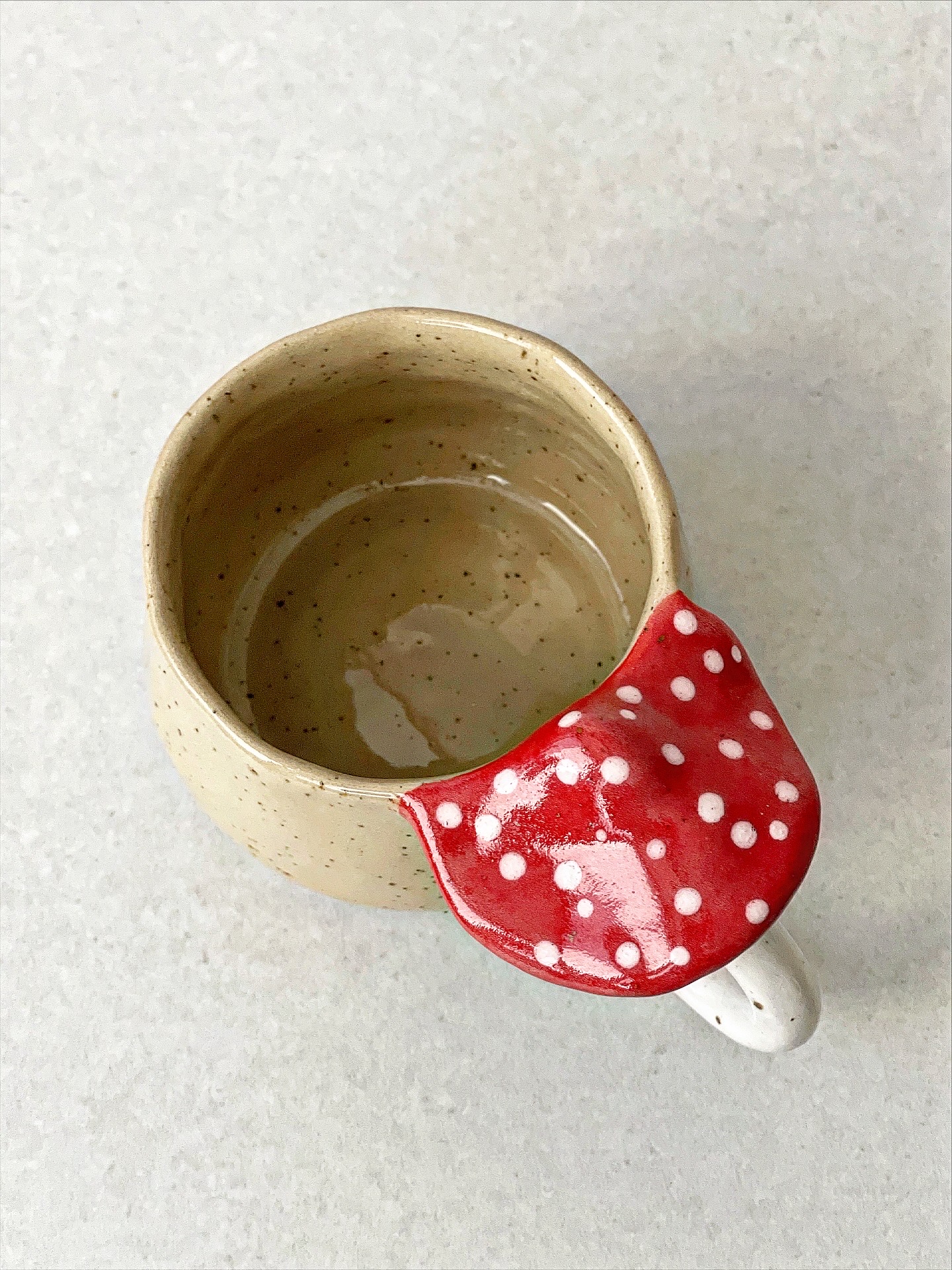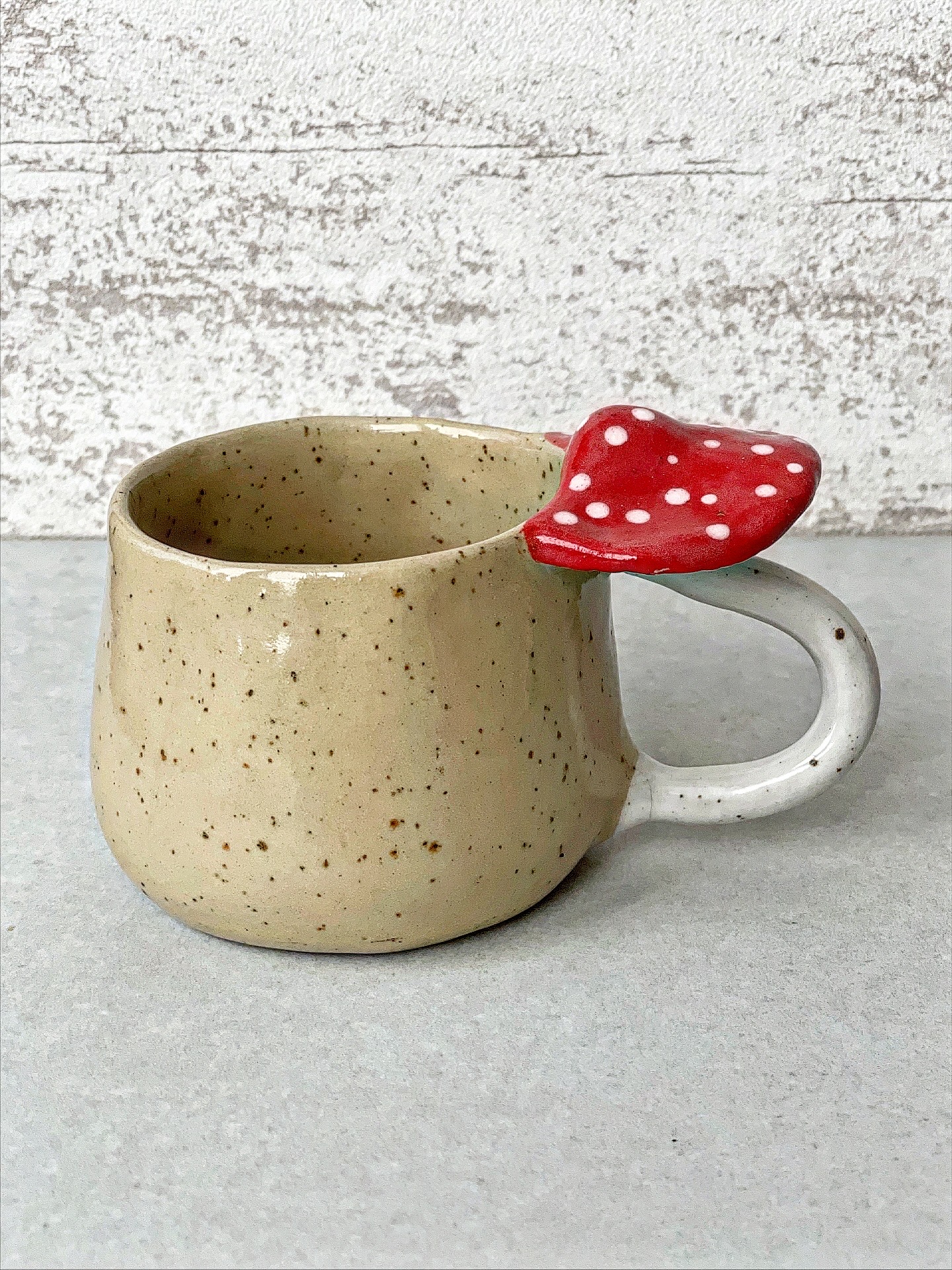 Kubek został wykonany z jasnej, kropkowej gliny. Z grzybkiem przy uchu.