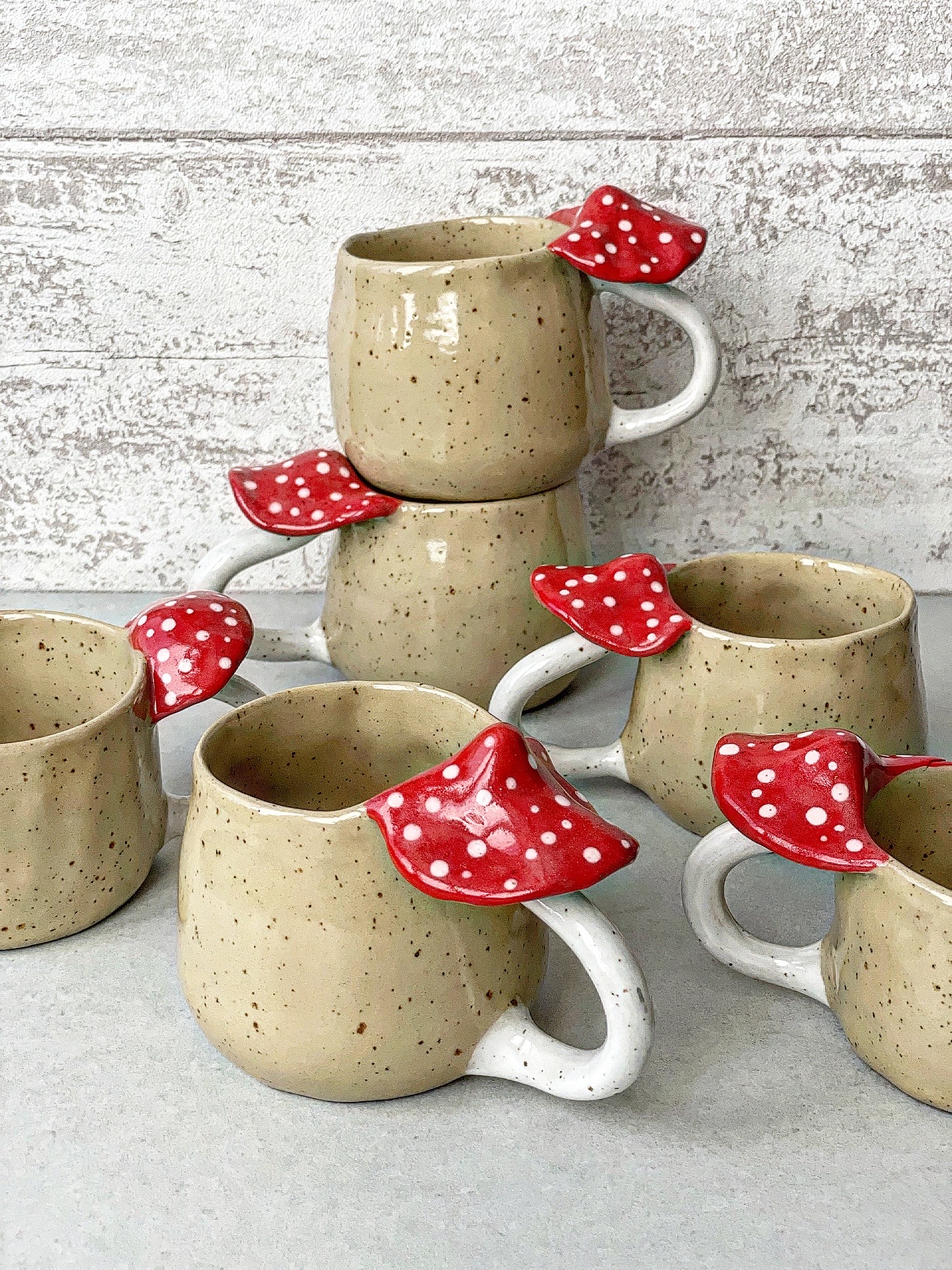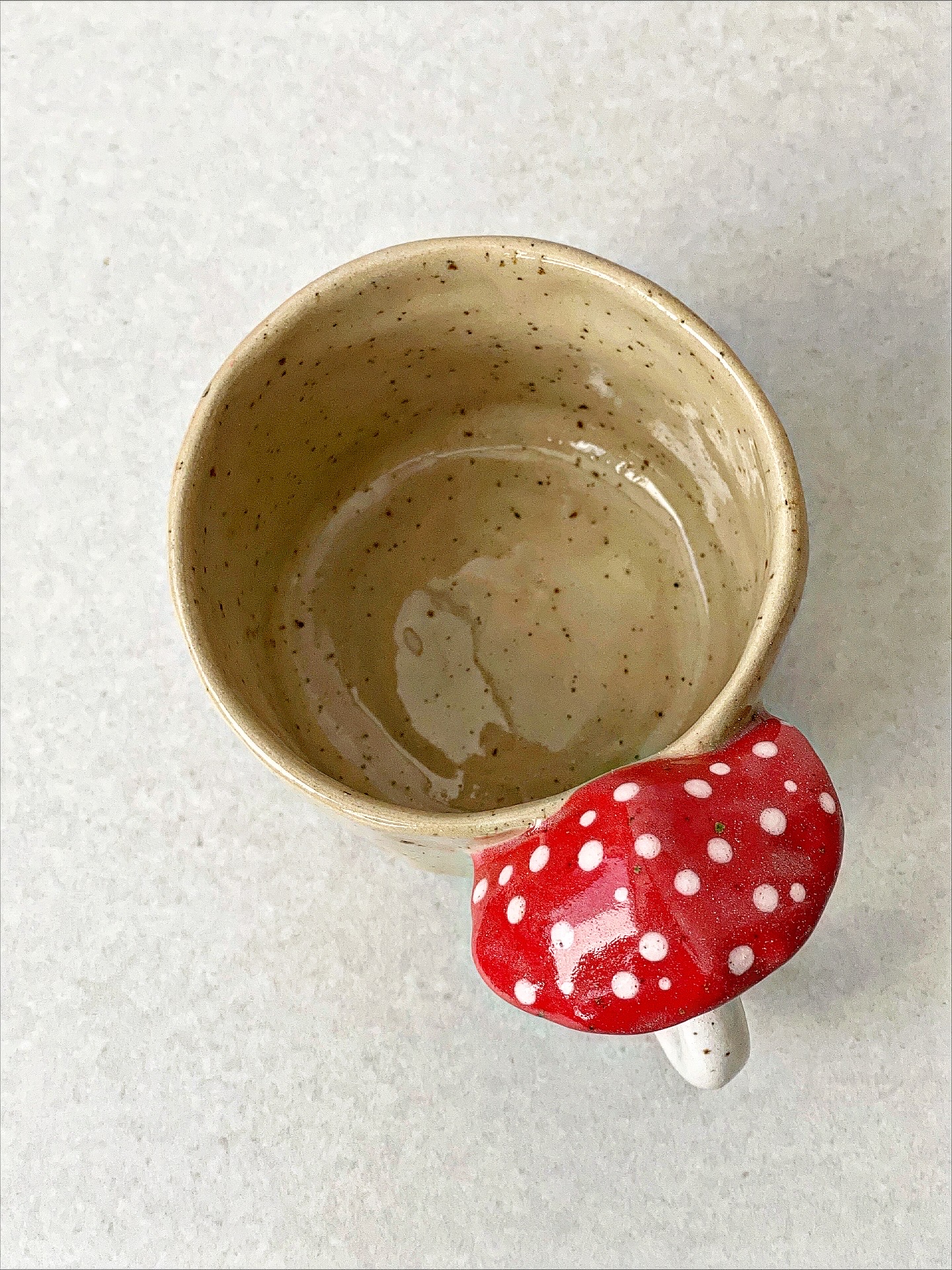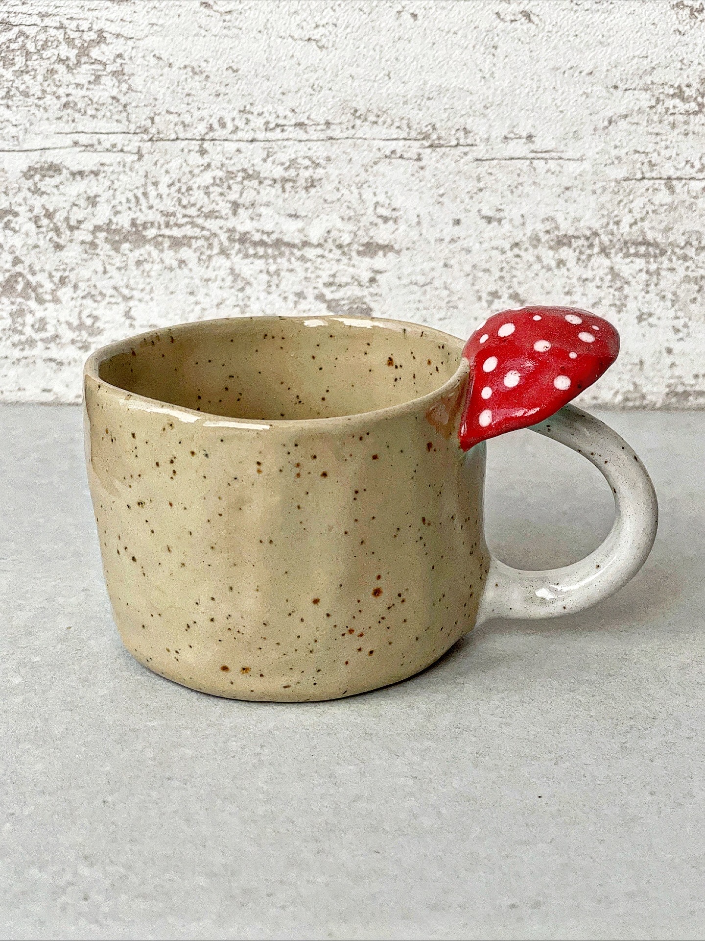 Kubek został wykonany z jasnej, kropkowej gliny. Z grzybkiem przy uchu.