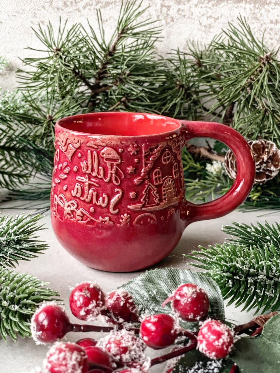 Ręcznie lepiony kubek, wykonany z jasnej gliny. Ze świątecznym wzorem.