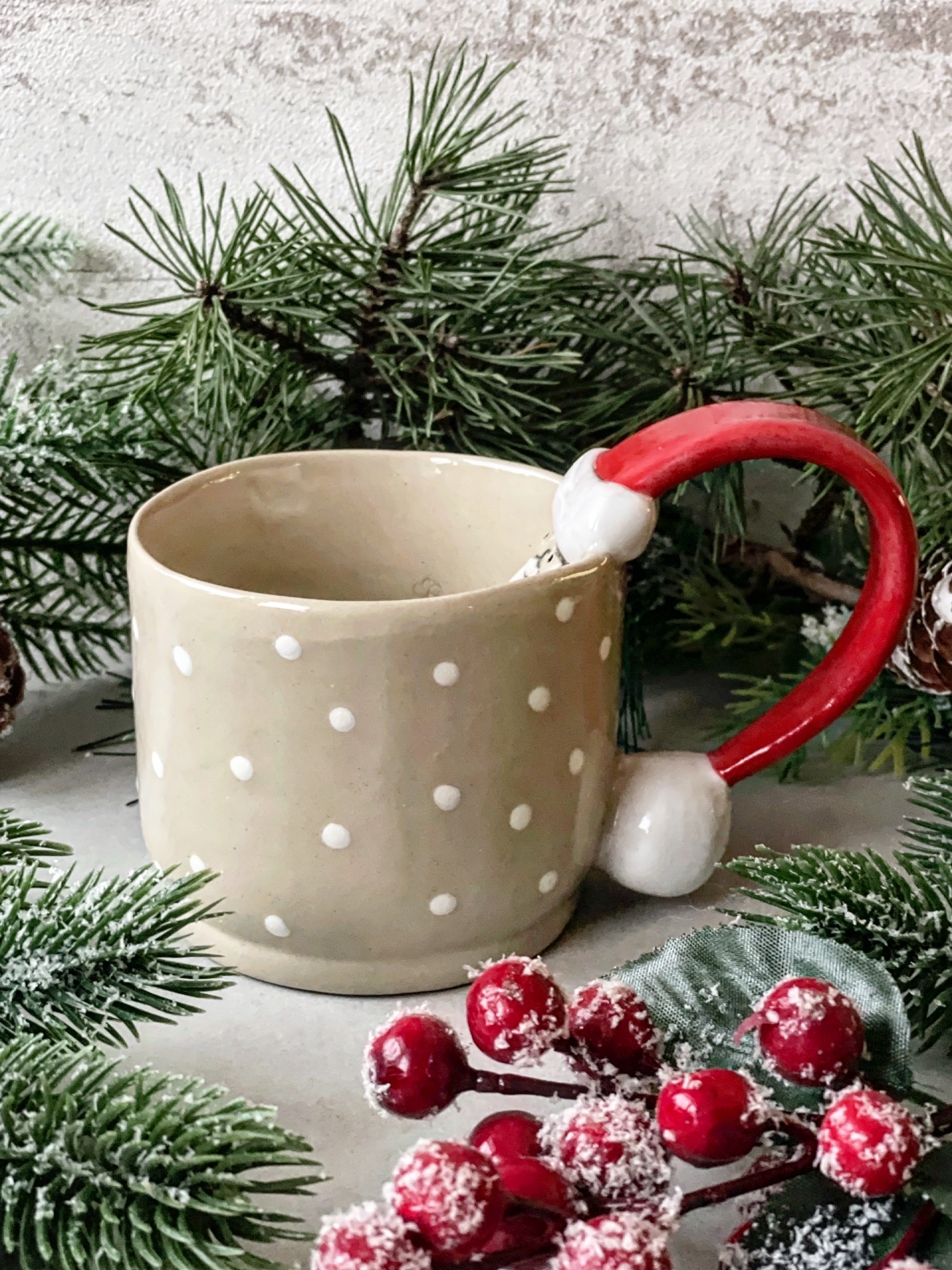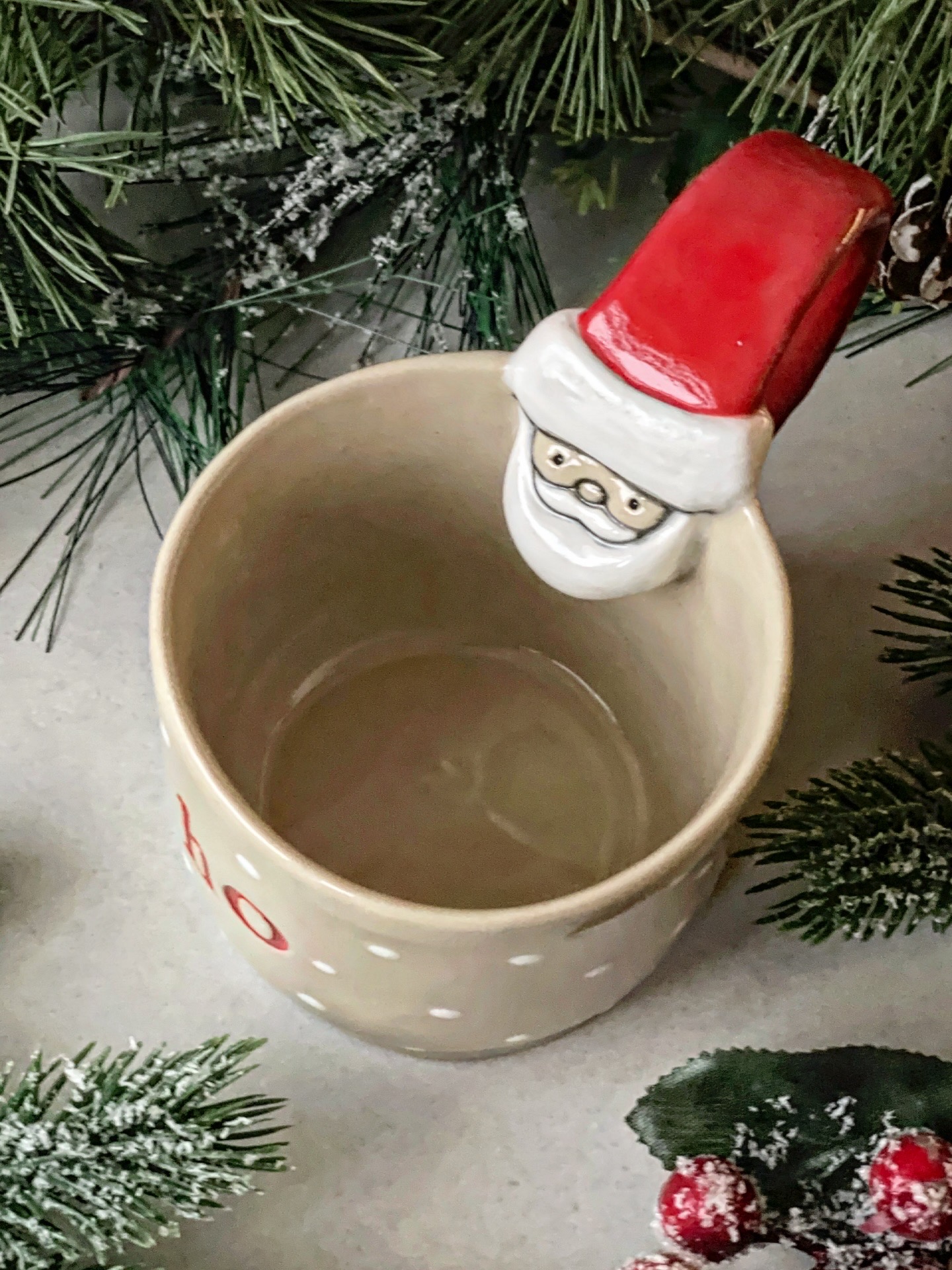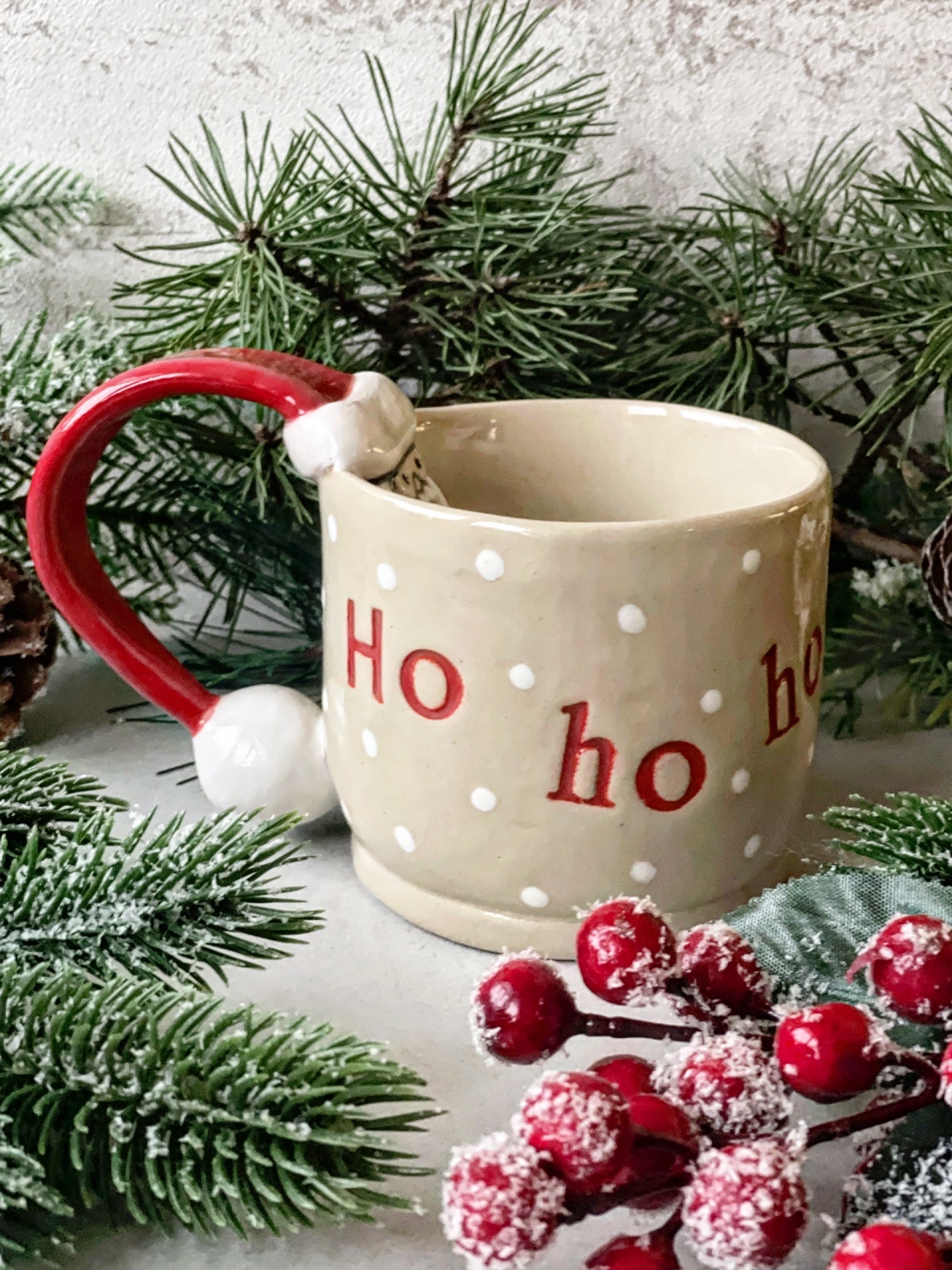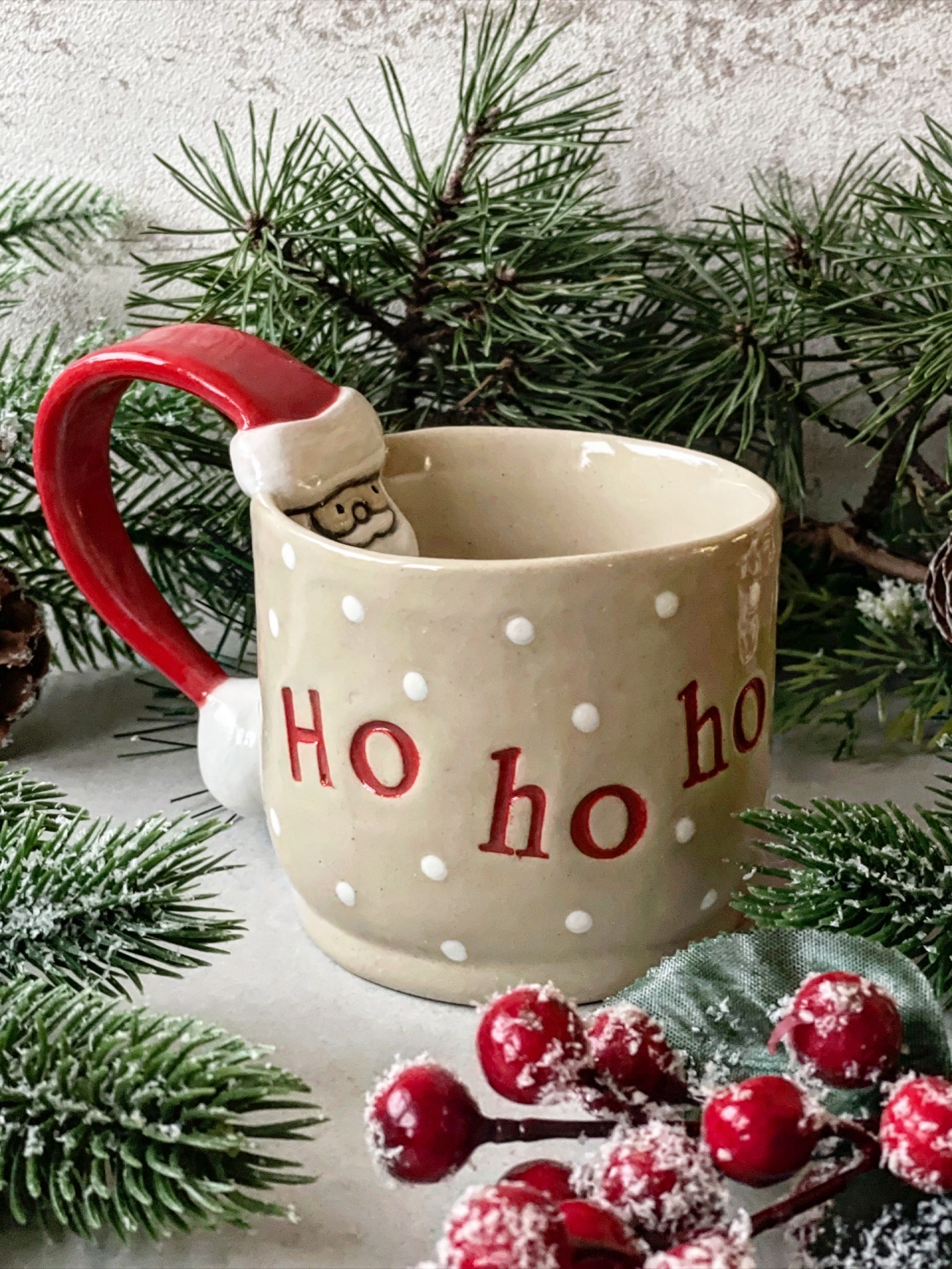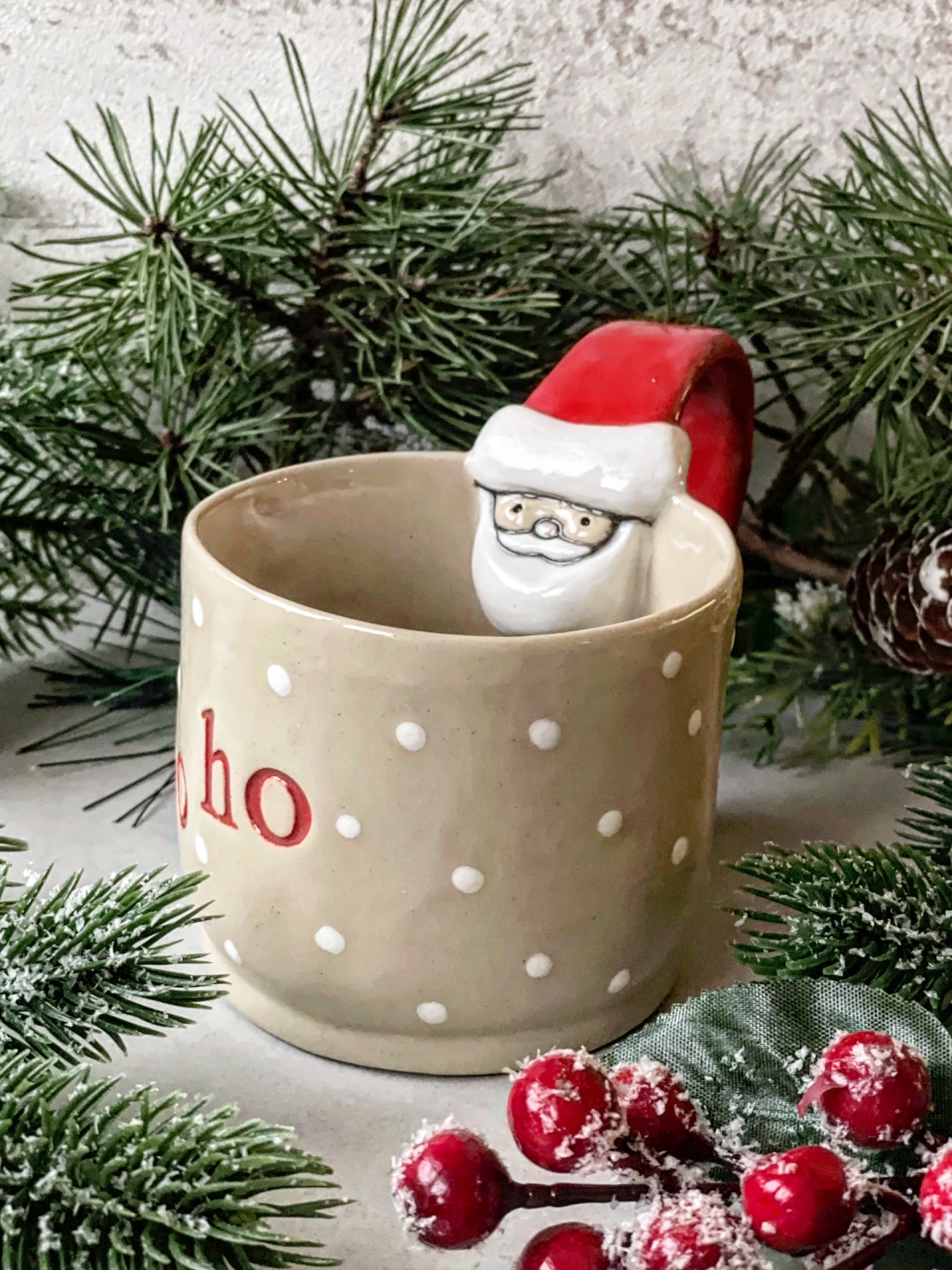 Ręcznie lepiony kubek, wykonany z jasnej gliny. Z wyrzeźbionym Świętym Mikołajem, napisem "Ho ho ho" i kropeczkami.