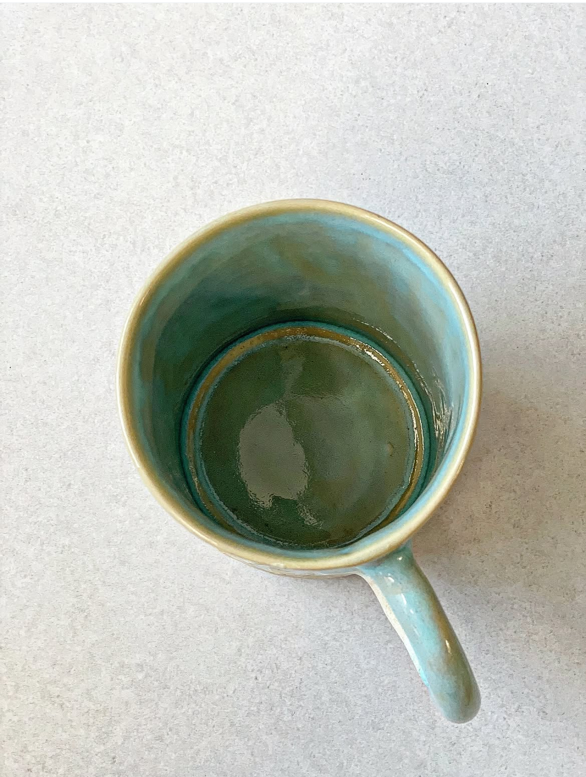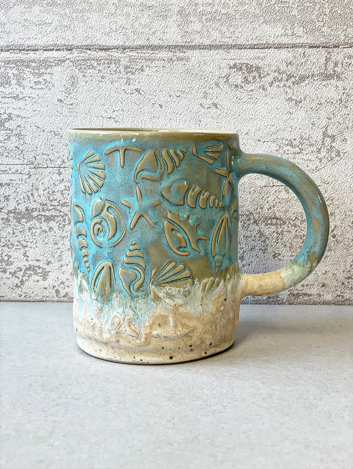 Ręcznie lepiony kubek ceramiczny wykonany z jasnej gliny. Ze wzorem w muszelki.