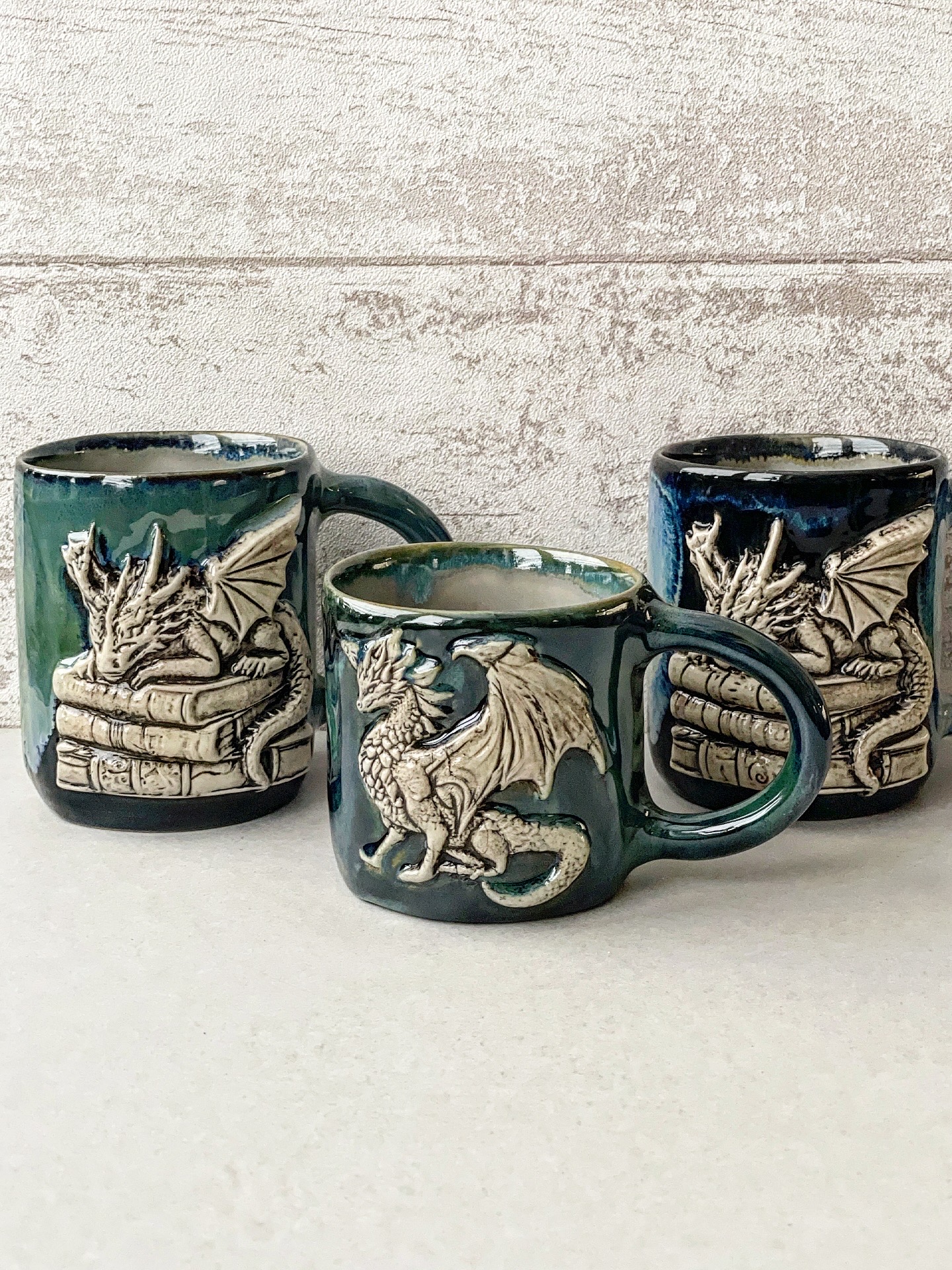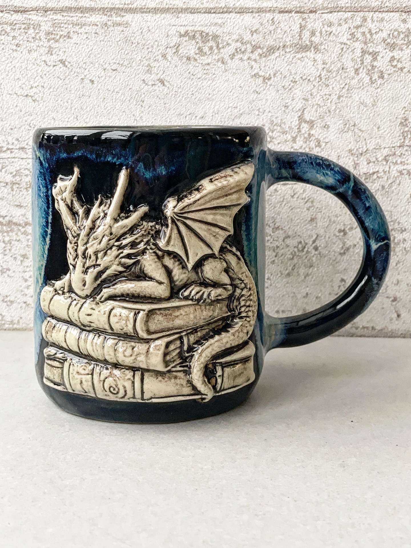 Ręcznie lepiony kubek, wykonany z jasnej gliny. Z wypukłym smokiem.