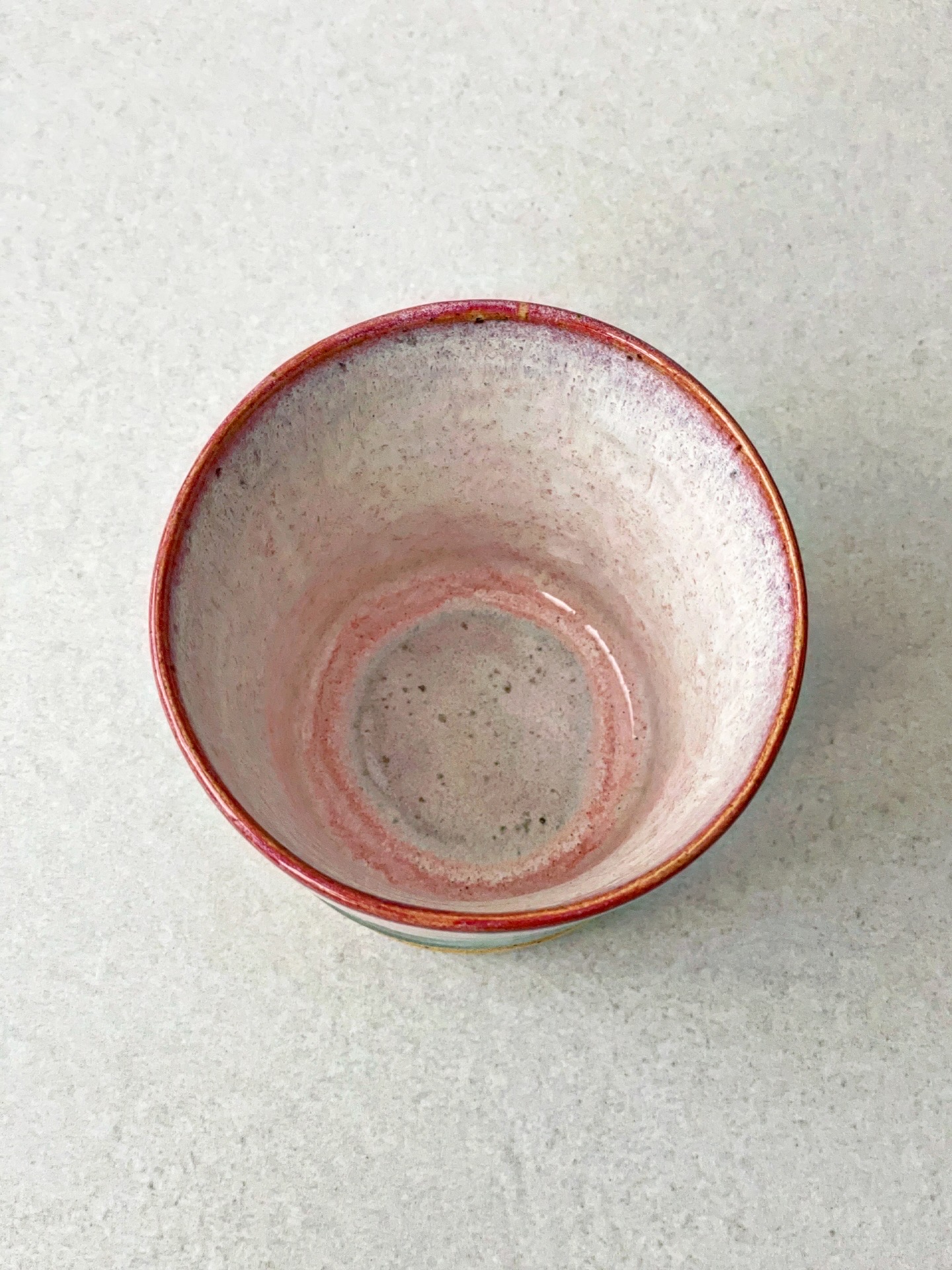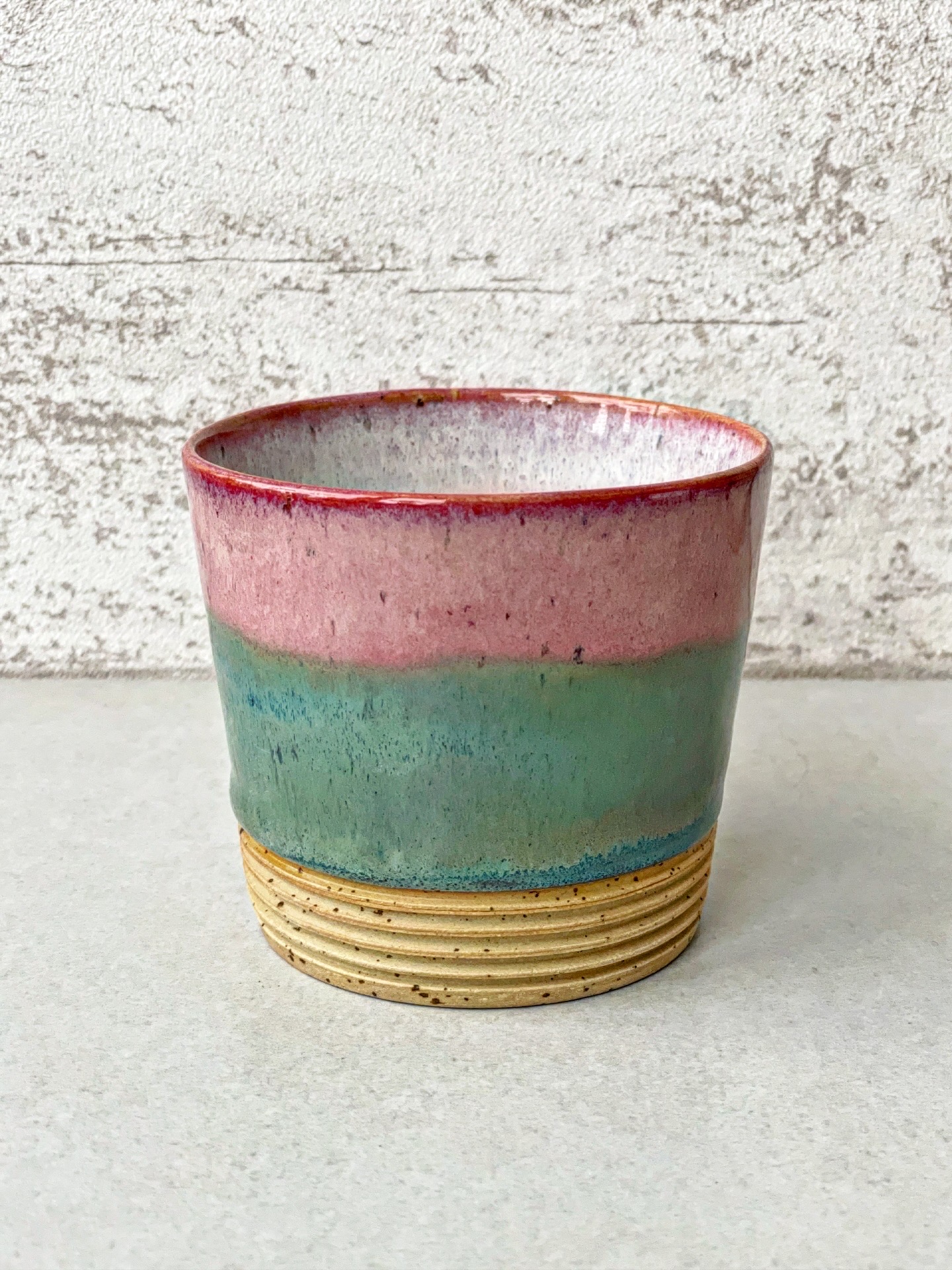 Kubek bez ucha, wykonany ręcznie na kole z jasnej gliny.