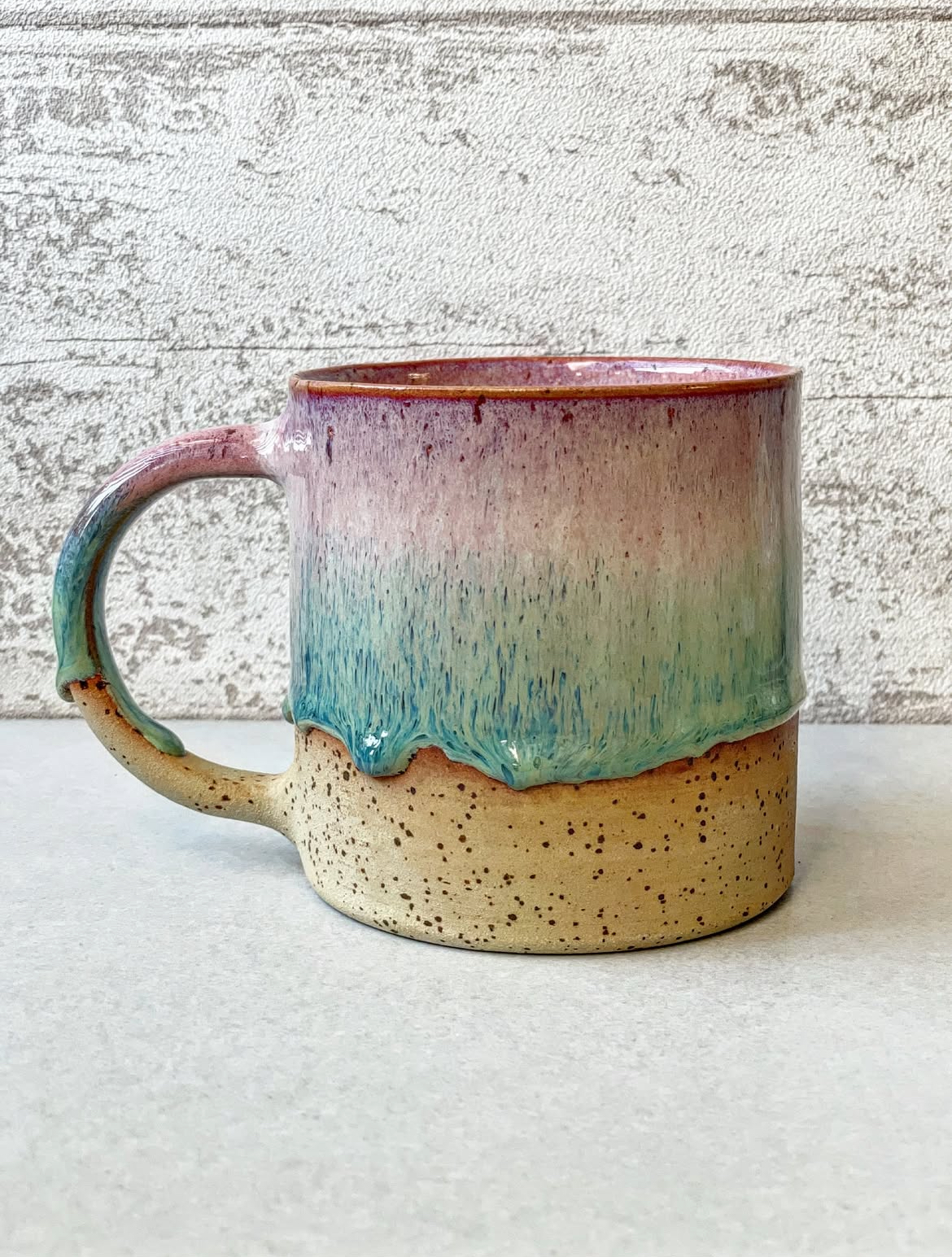 Kubek ceramiczny wykonany ręcznie z jasnej, kropkowej gliny.