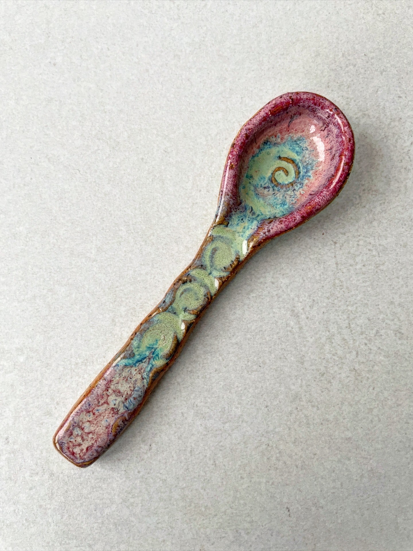 Łyżka ceramiczny wykonany ręcznie z jasnej, kropkowej gliny.