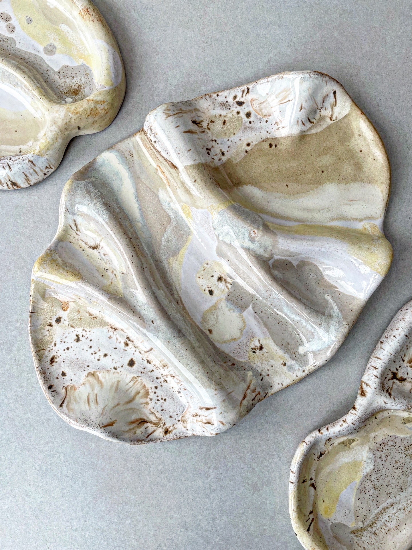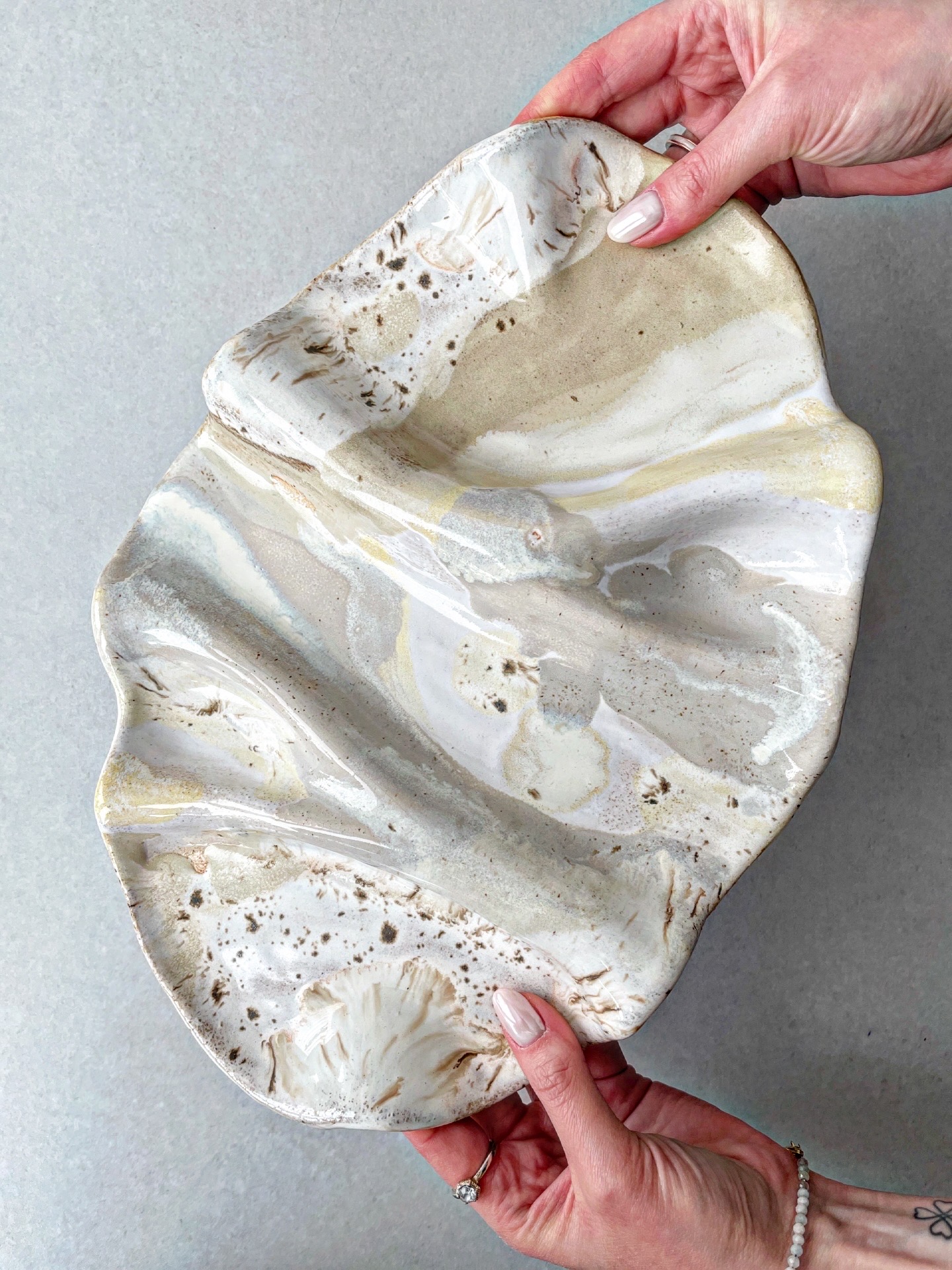 Patera ceramiczna wykonana ręcznie z jasnej gliny. Dzięki swojemu nieregularnemu i "pogiętemu" kształtowi Idealnie sprawdzi się do podawania różnych przekąsek.