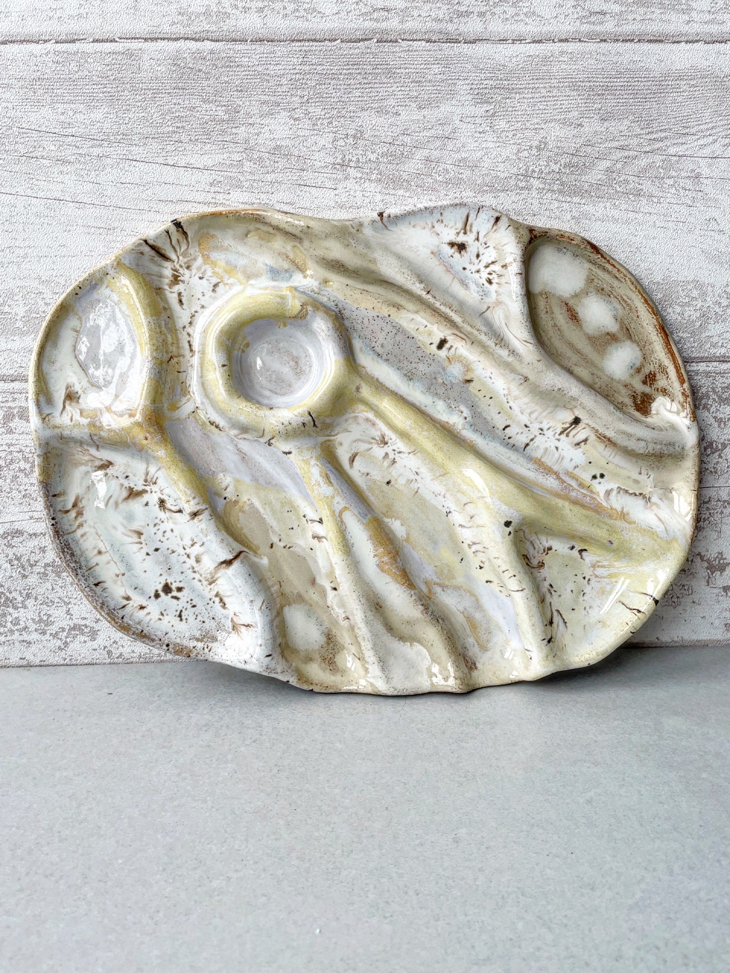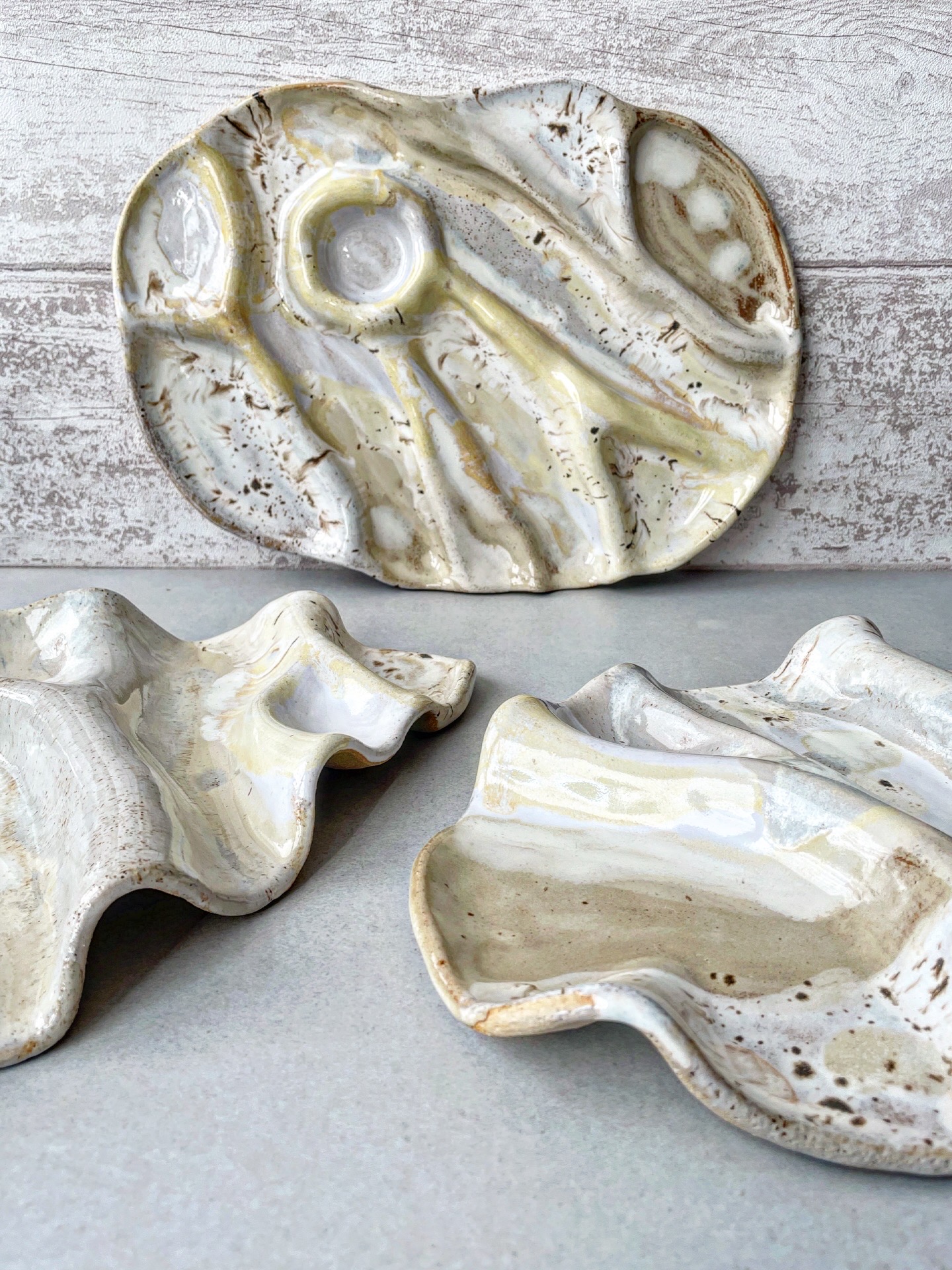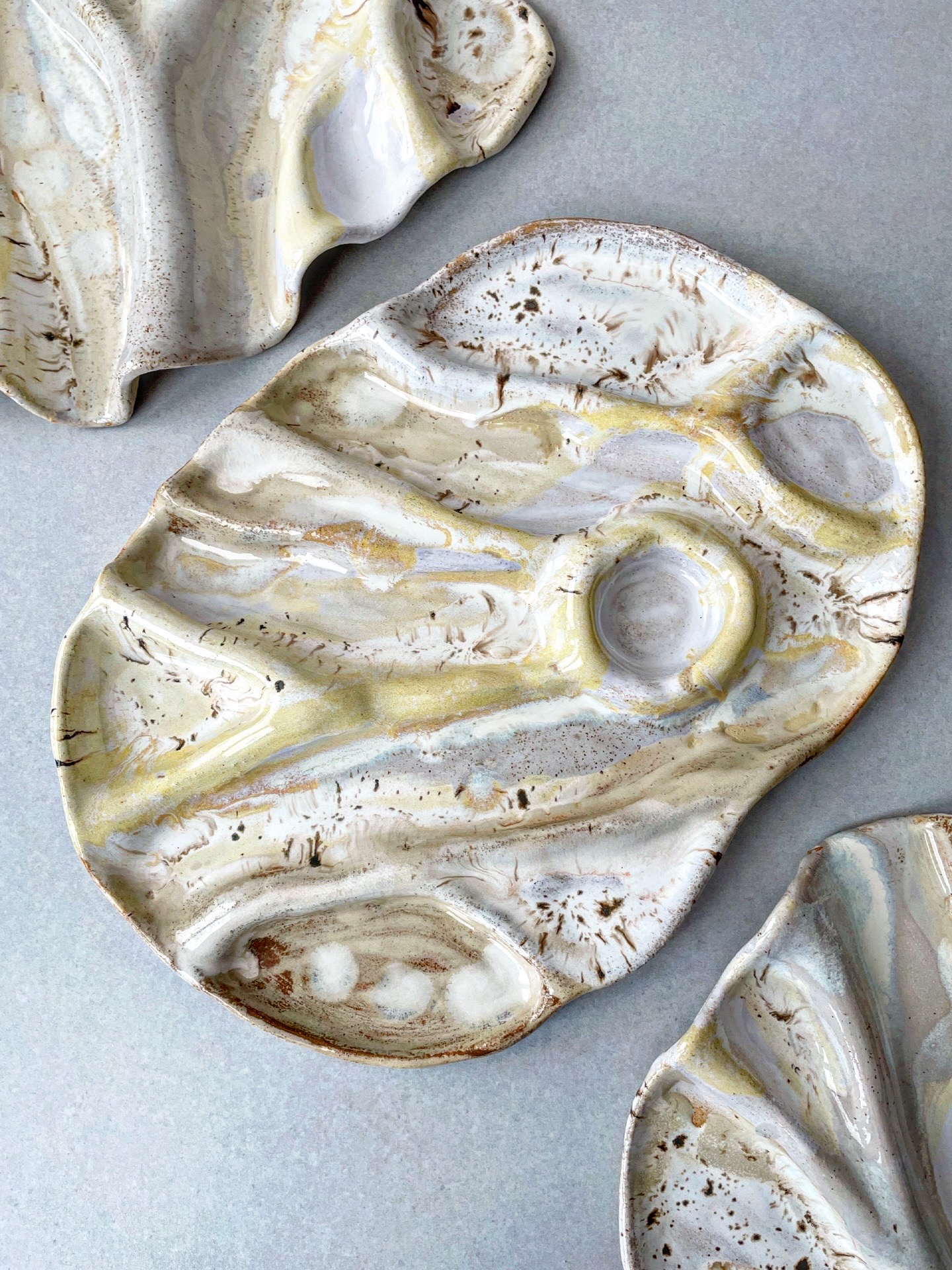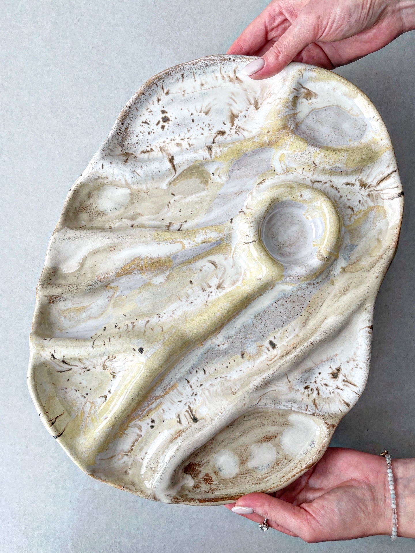 Patera ceramiczna wykonana ręcznie z jasnej gliny. Dzięki swojemu nieregularnemu i "pogiętemu" kształtowi Idealnie sprawdzi się do podawania różnych przekąsek.