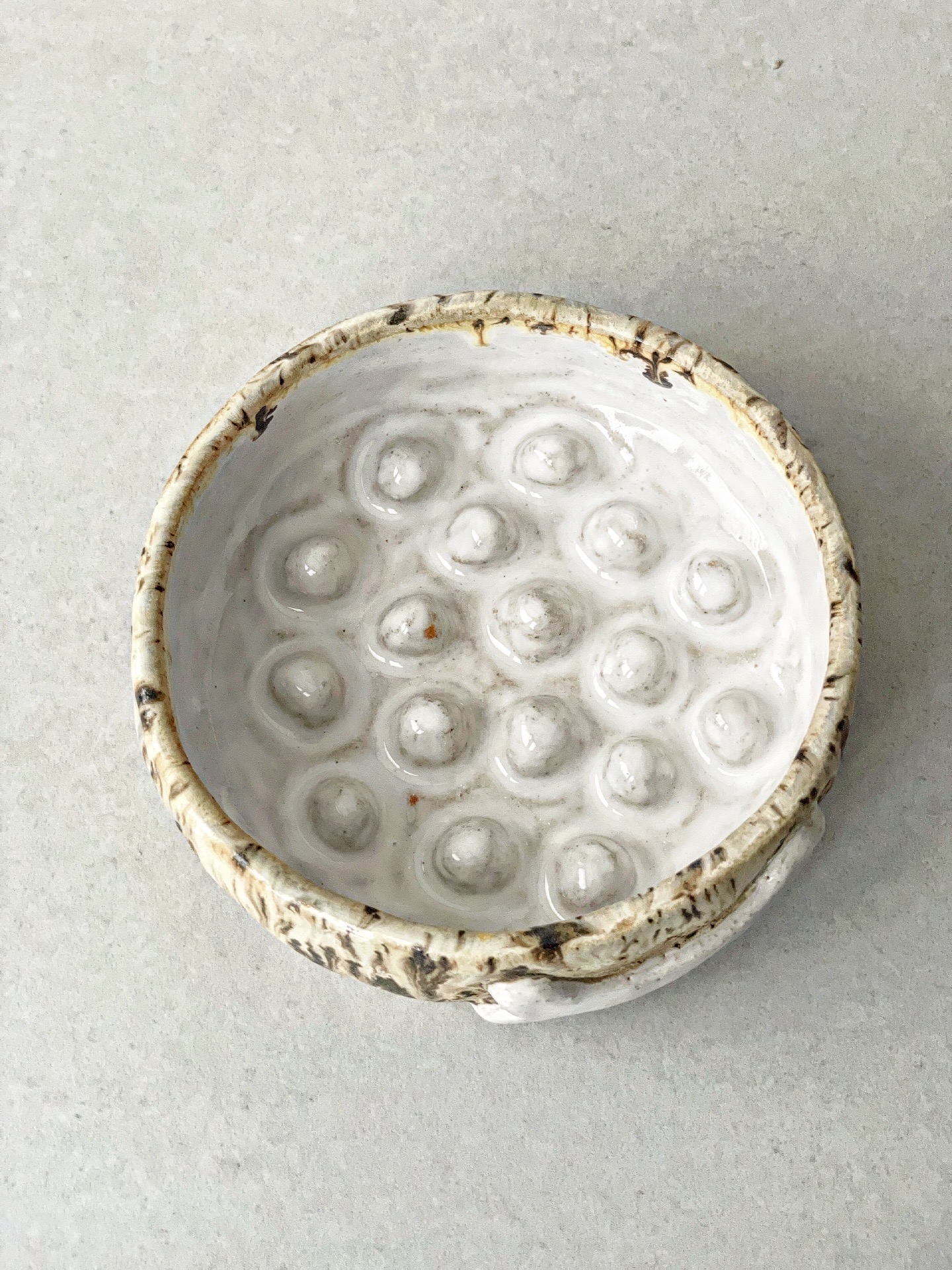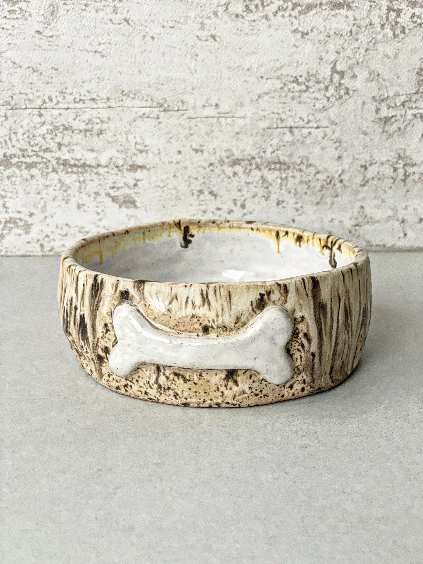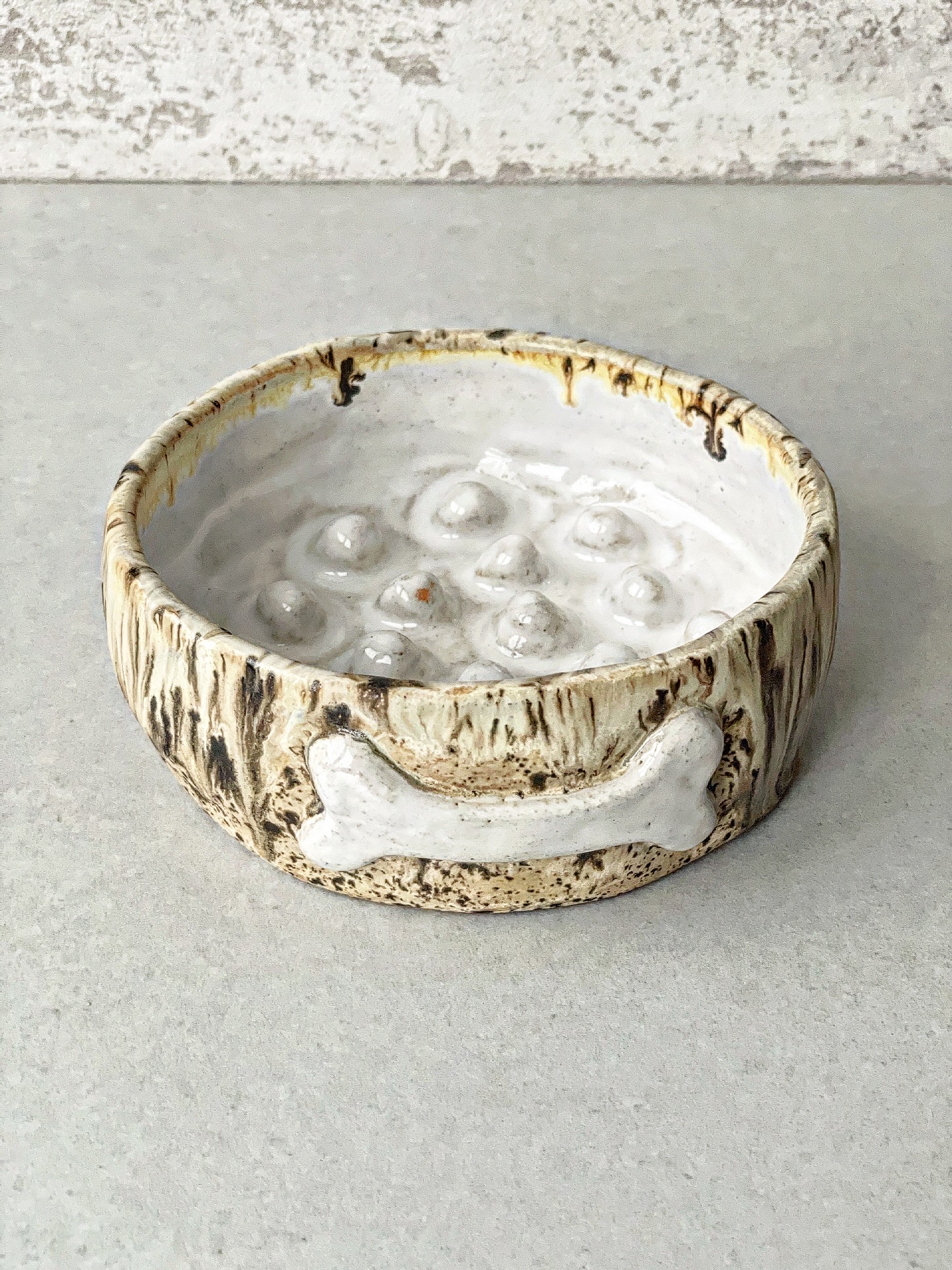 Miska dla psa wykonana z jasnej gliny. Od zewnątrz posiada wyrzeźbioną kostkę, a w środku wypustki mające na celu spowolnić jedzenie psa.