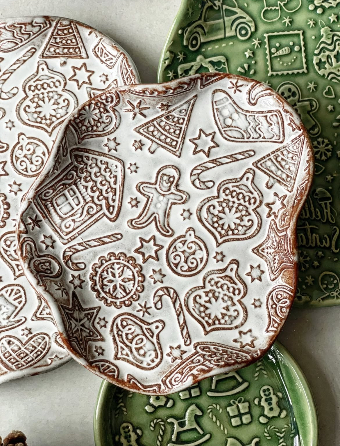 Ręcznie lepiony talerz, wykonany z ciemnej gliny. Ze świątecznym wzorem.