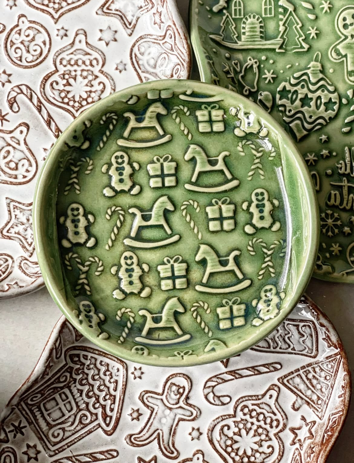 Ręcznie lepiony talerz, wykonany z jasnej gliny. Ze świątecznym wzorem.