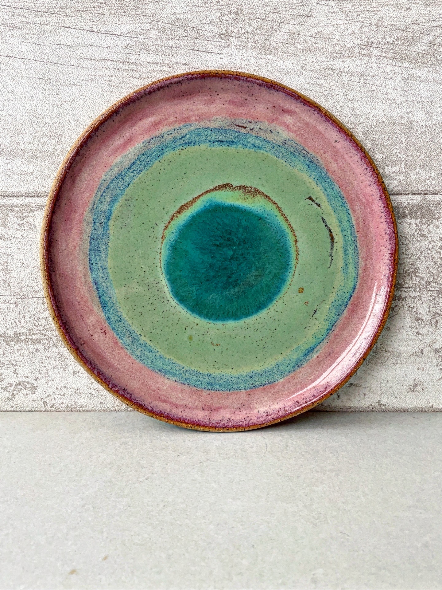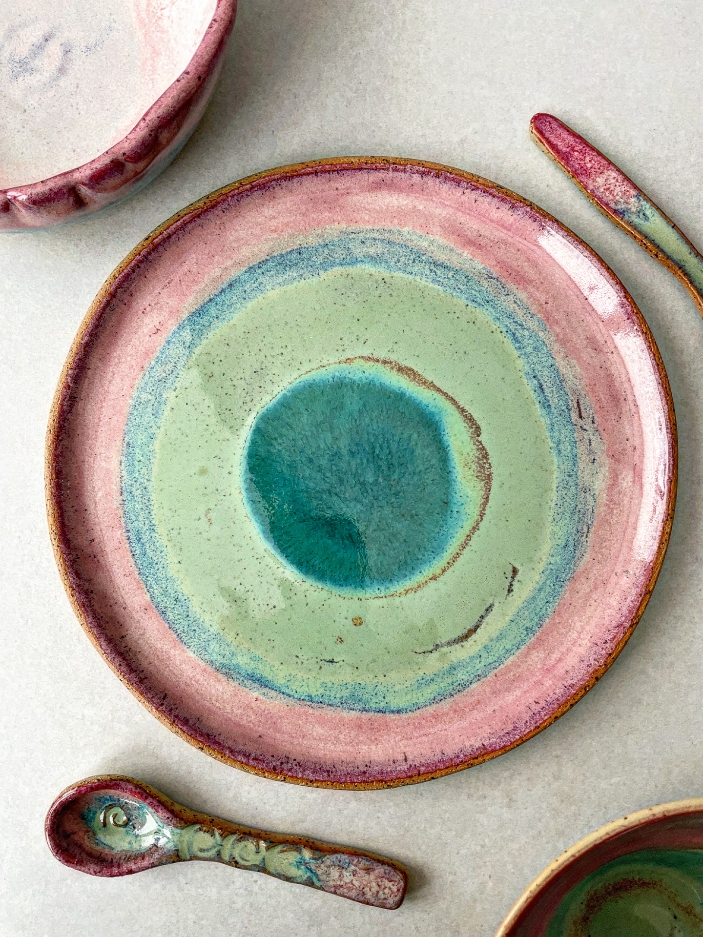 Talerz ceramiczny wykonany ręcznie z jasnej, kropkowej gliny.